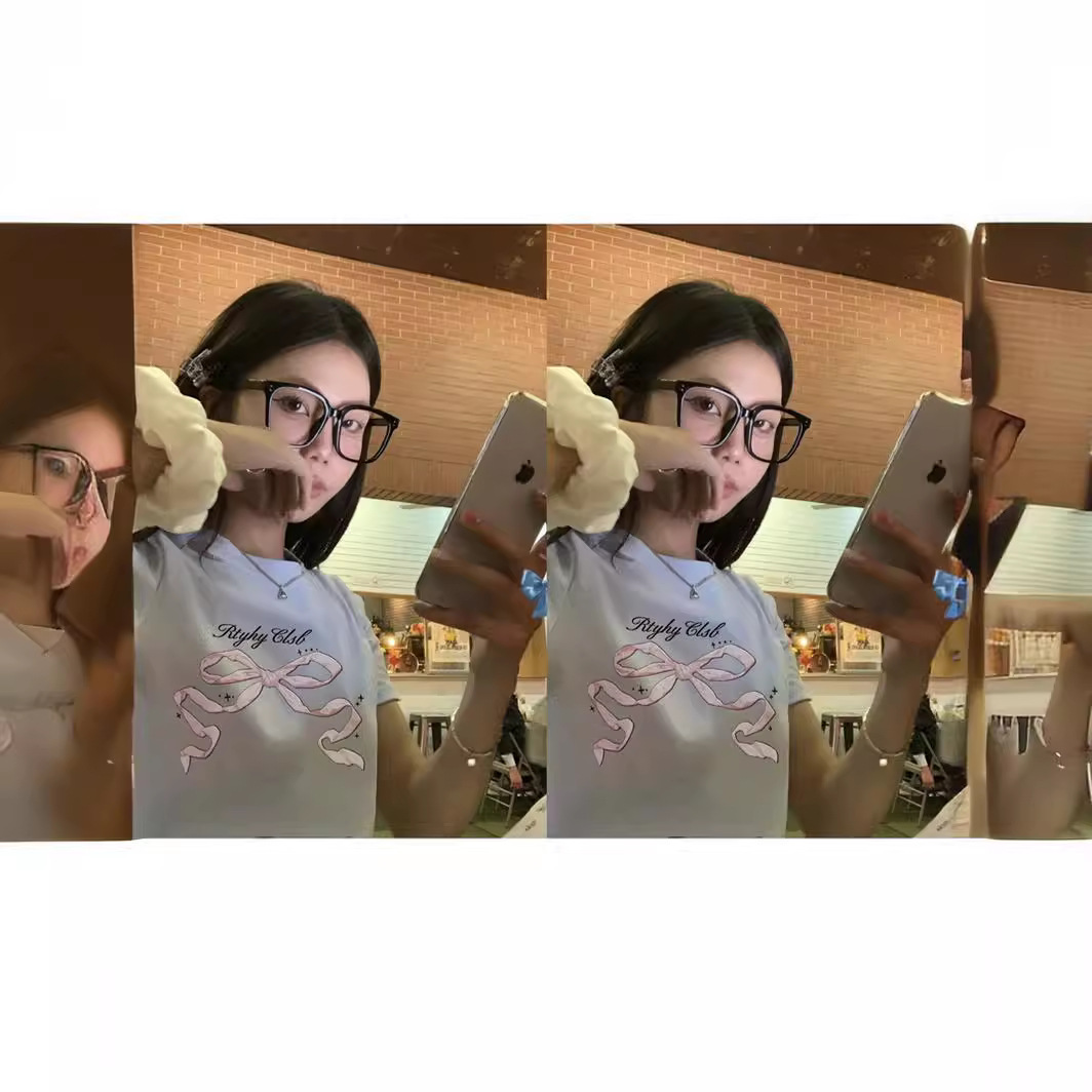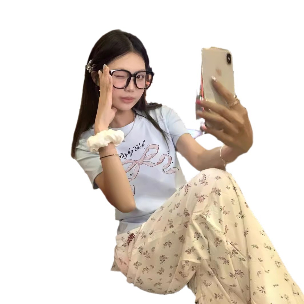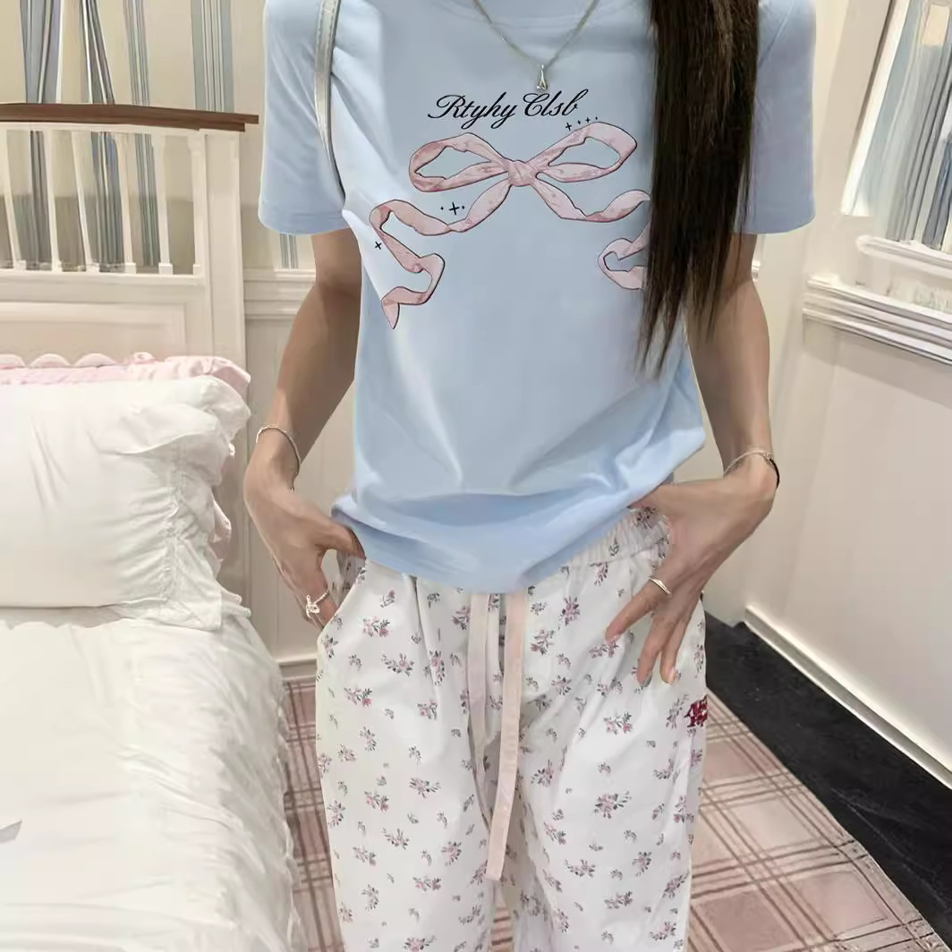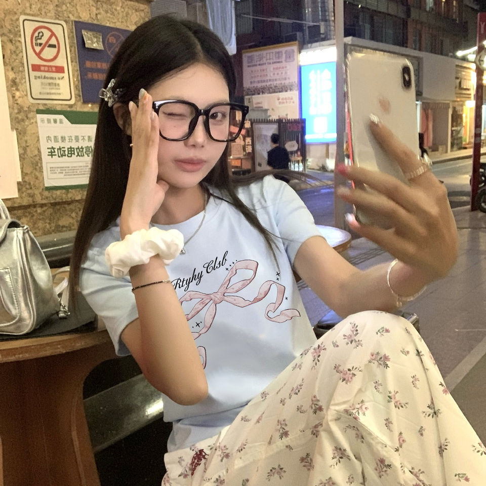 天蓝色纯棉短袖t恤女夏季新款设计感小众字母蝴蝶结小个子上衣潮