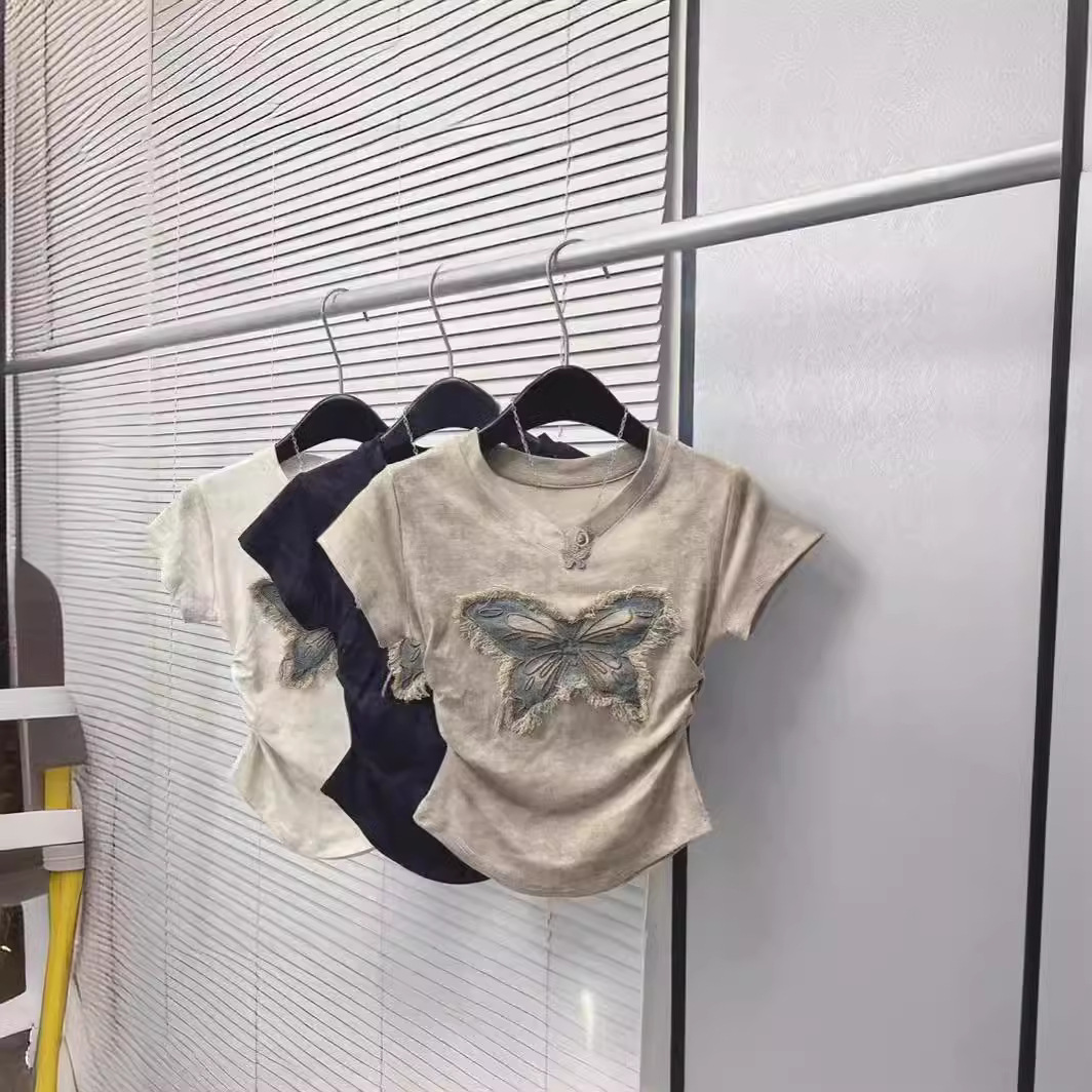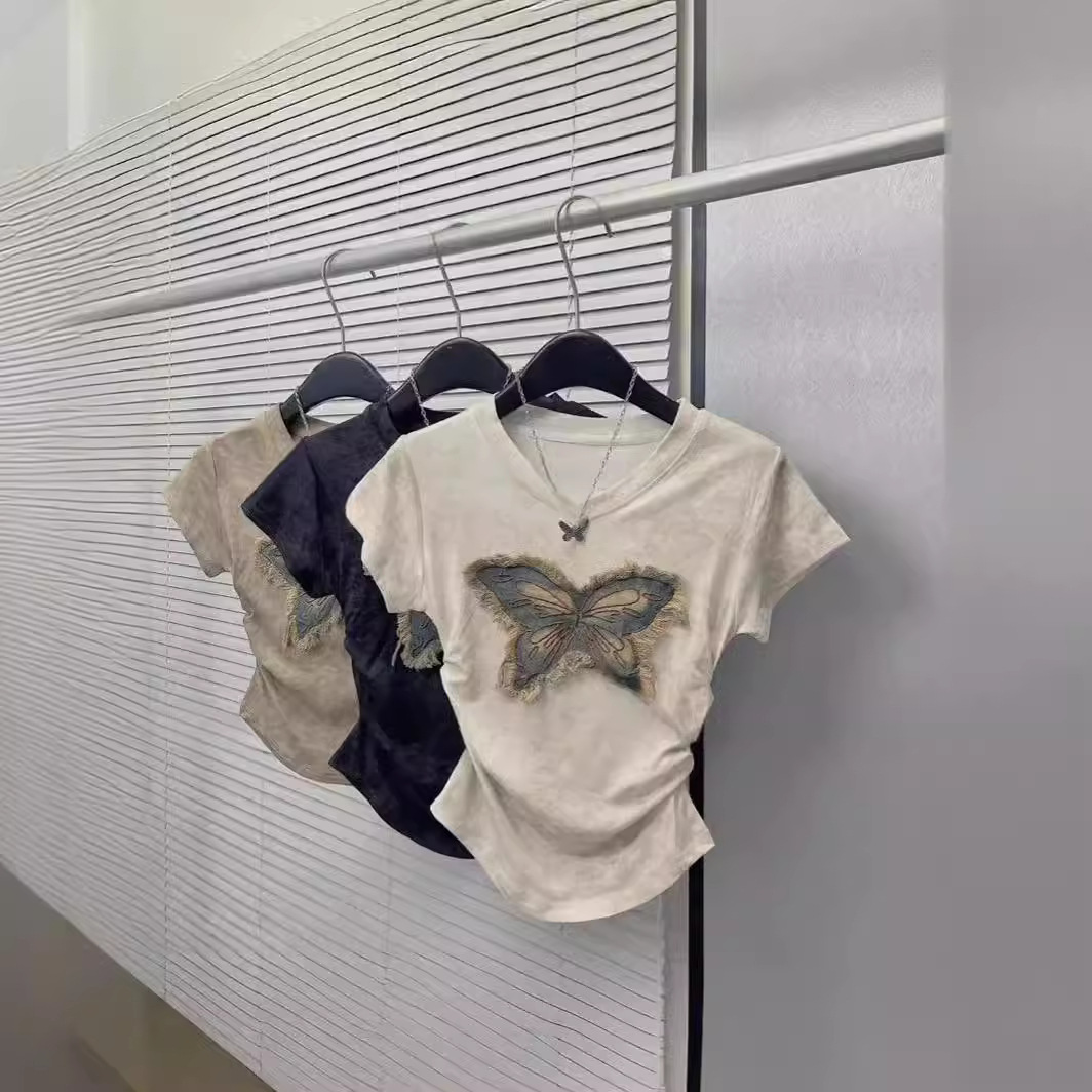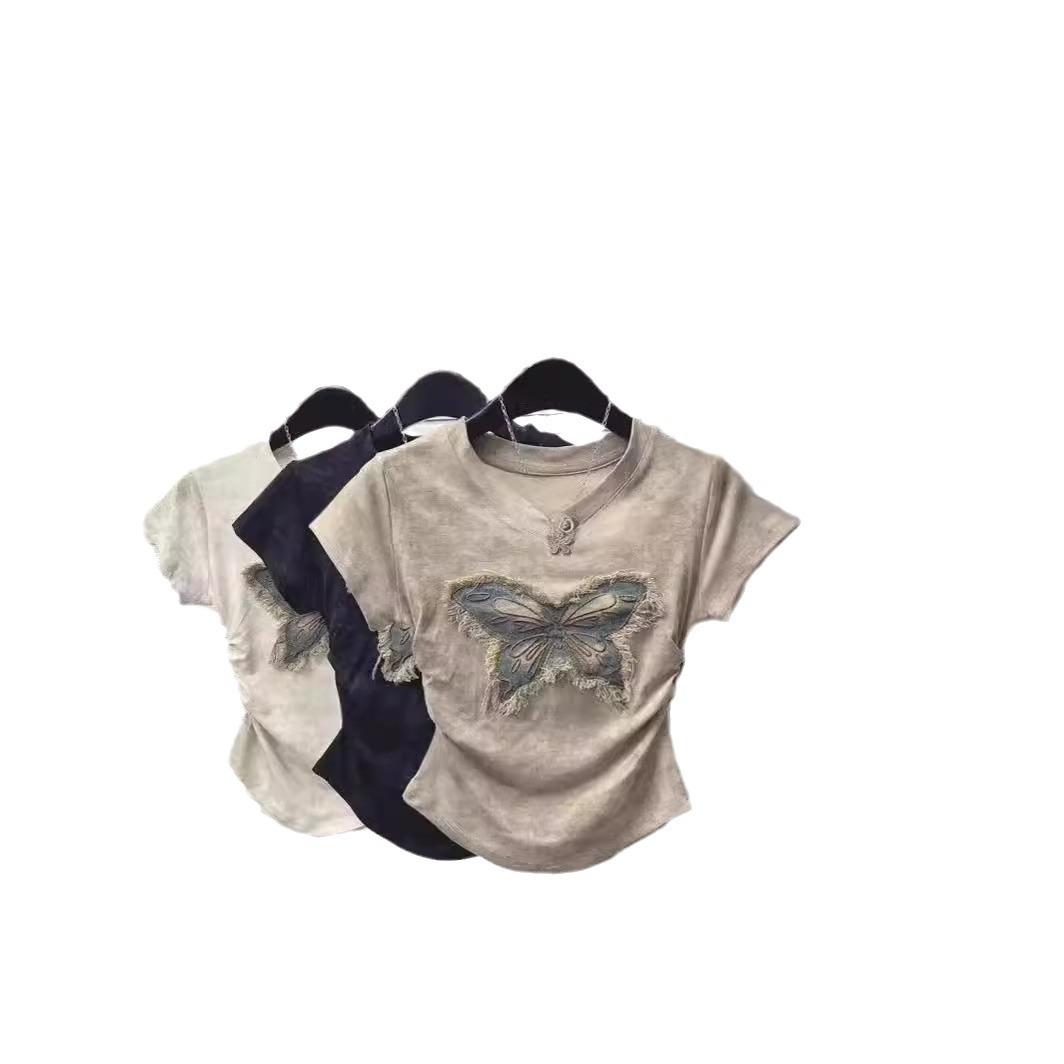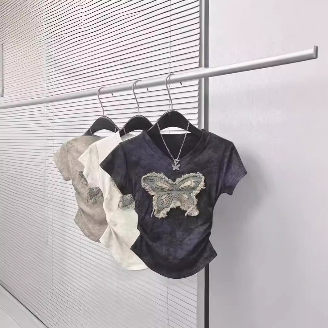 V领褶皱t恤女夏季蝴蝶拼接潮流重工上衣辣妹美式百搭正肩短袖上衣