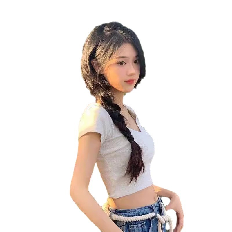 不规则u领短袖t恤女新款韩版修身高腰显瘦短款学生纯色上衣潮