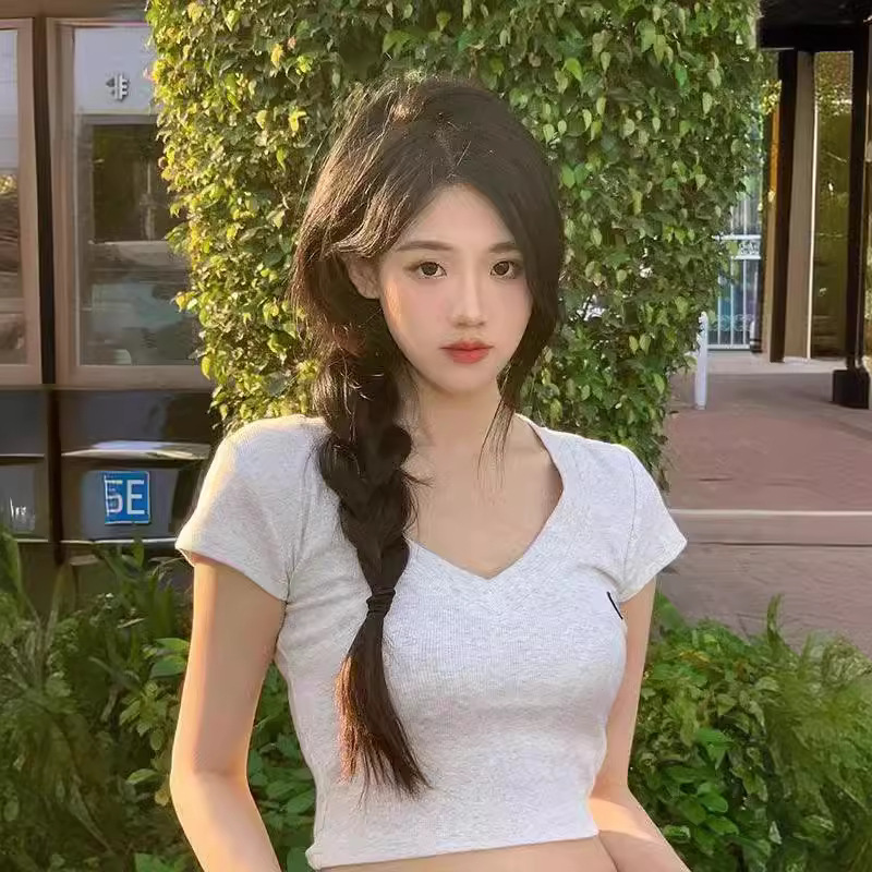 纯欲风莫代尔V领夏季辣妹上衣修身显瘦短款设计感女露脐短袖t