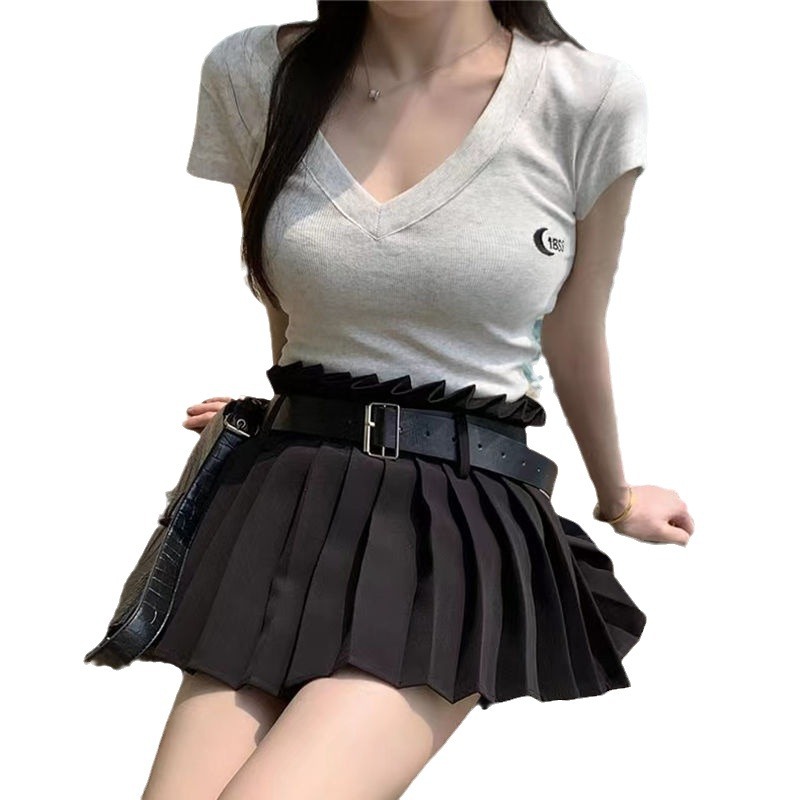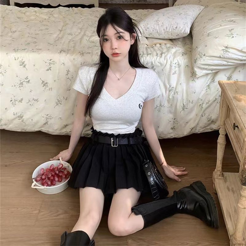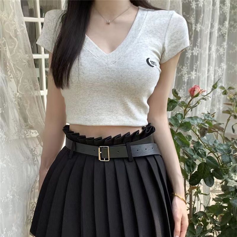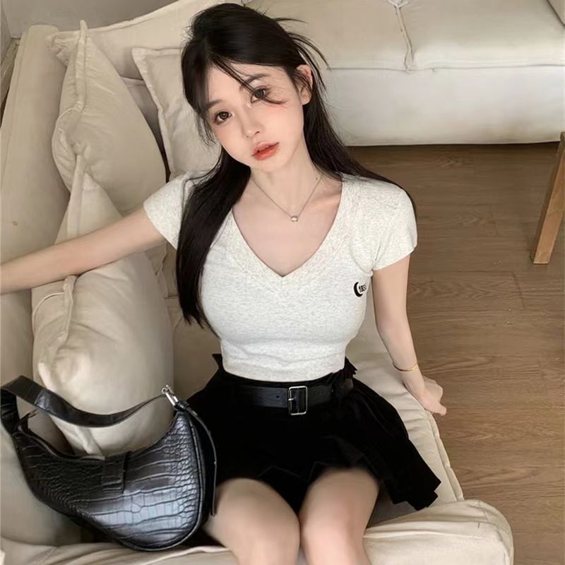 美式复古甜辣V领短袖t恤女夏季修身显瘦别致短款打底衫上衣