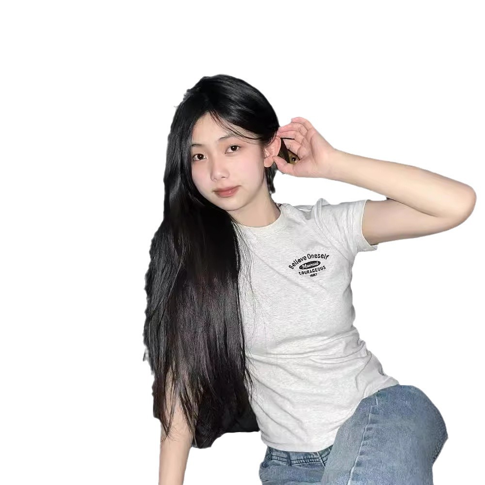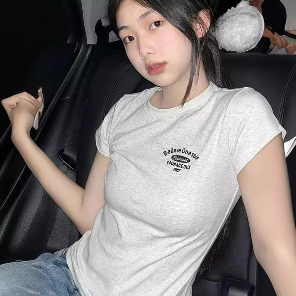 美式复古正肩刺绣字母短袖t恤女夏季设计感小众修身别致短款上衣