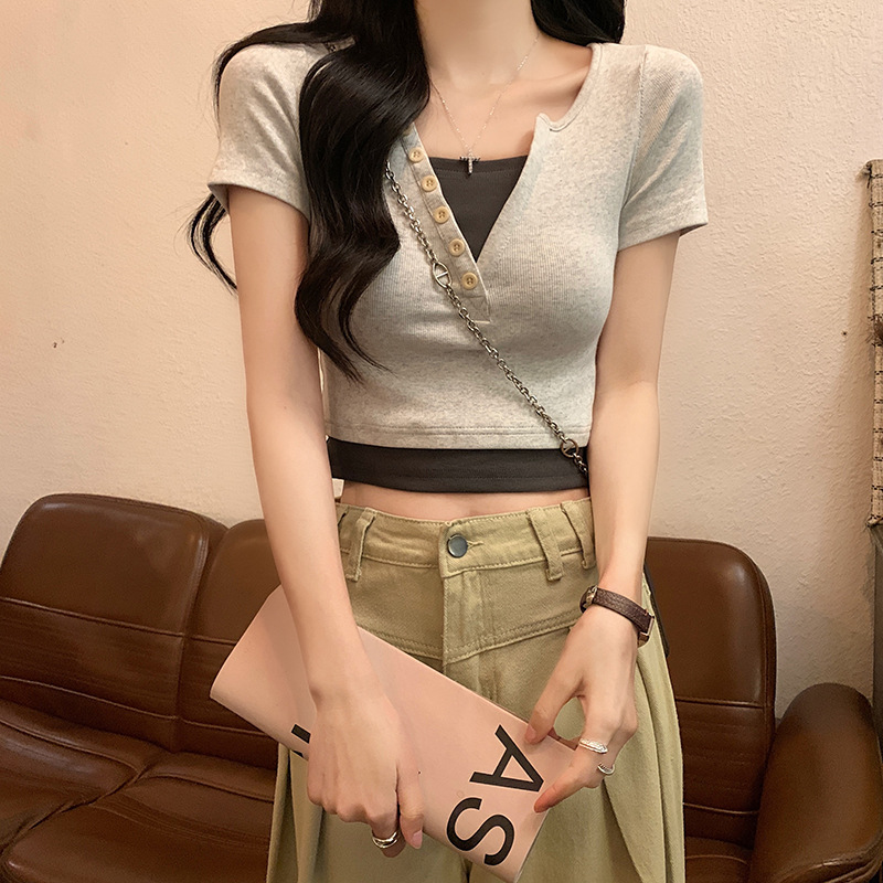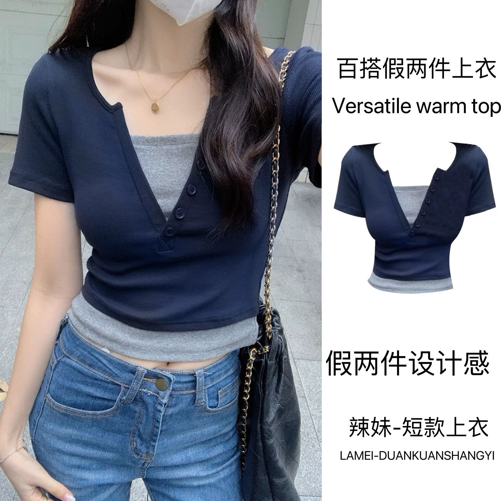 打底修身秋冬粉色领正短袖春夏新款拼色两件设计上衣短款纯欲t恤