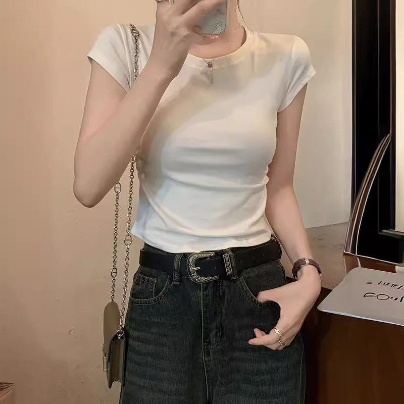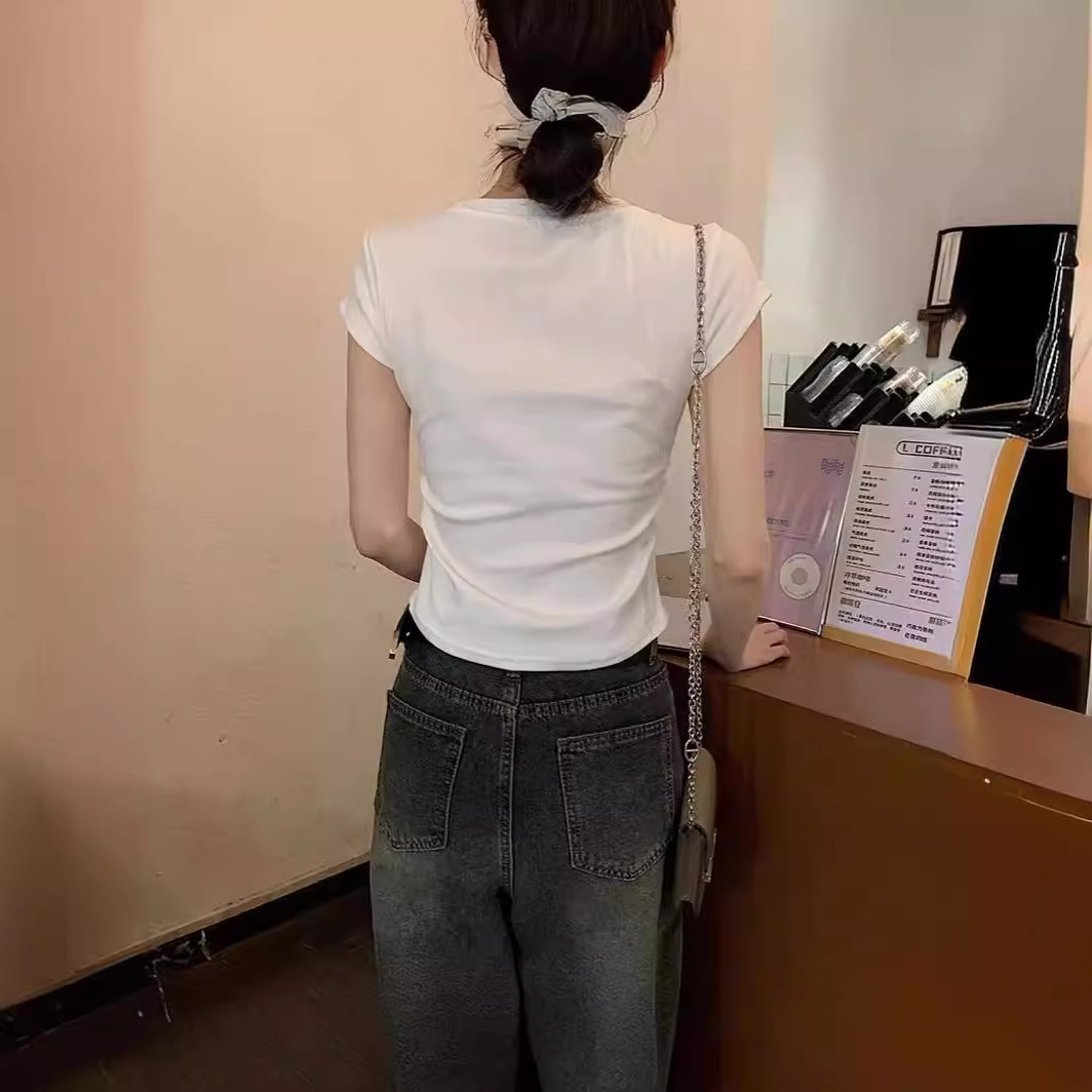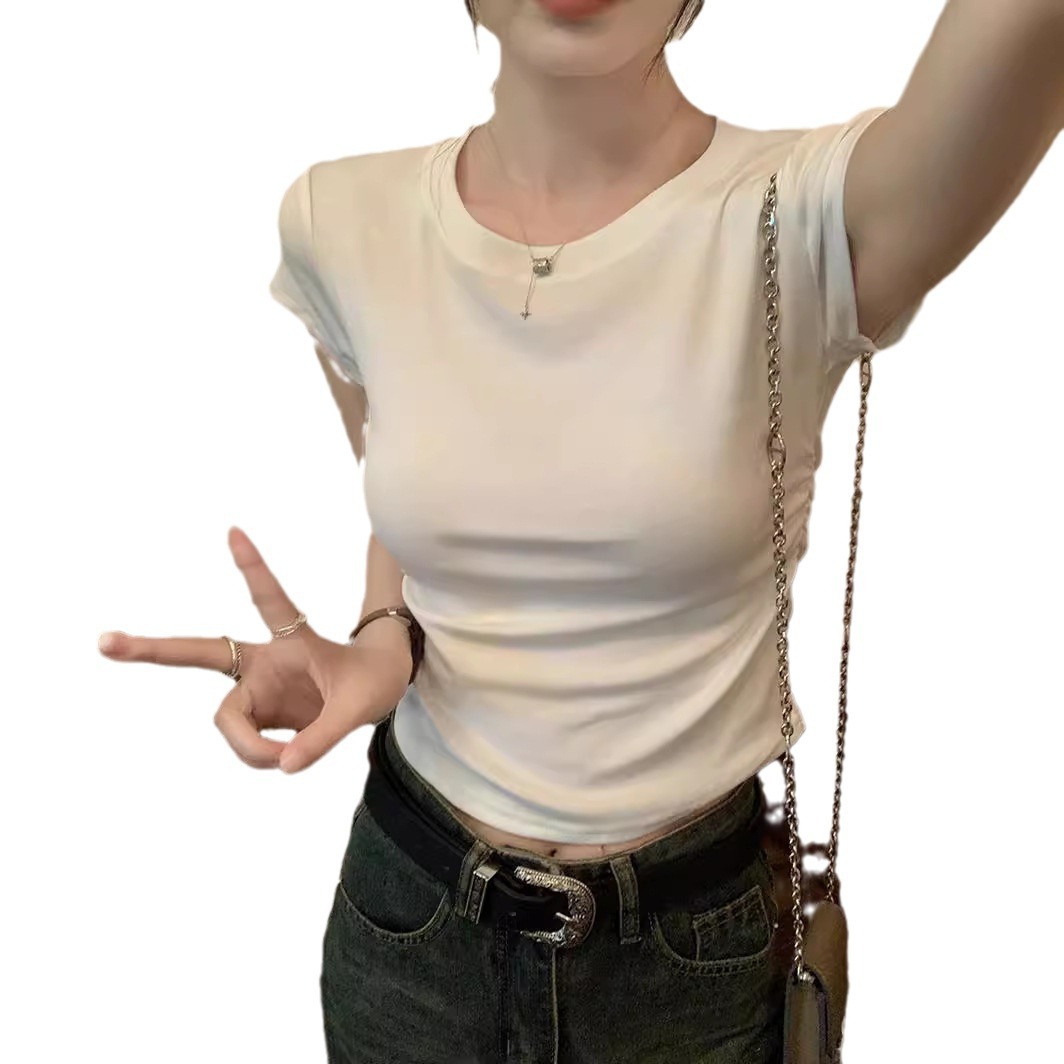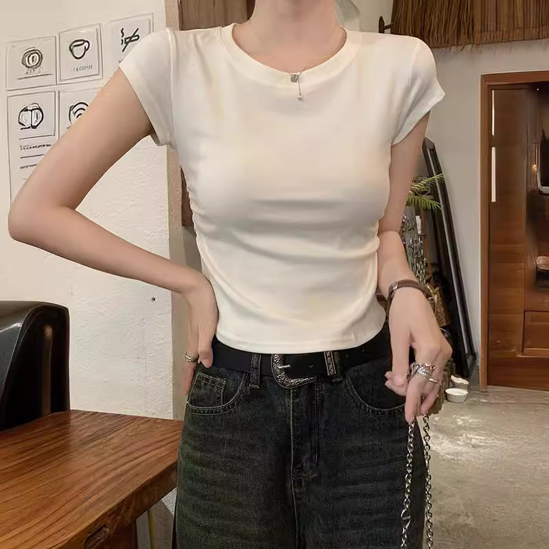 白色收腰褶皱短袖女夏季新款不规则正肩t恤显瘦打底上衣内搭