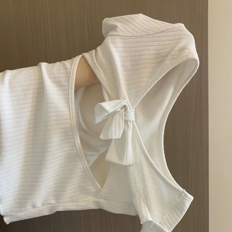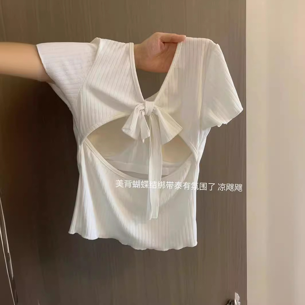 纯欲风正肩短袖t恤女夏季修身辣妹镂空美背打底衫带胸垫短款上衣