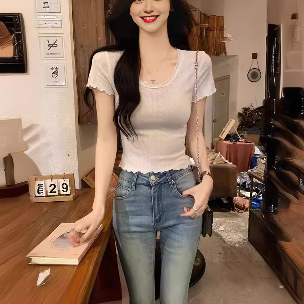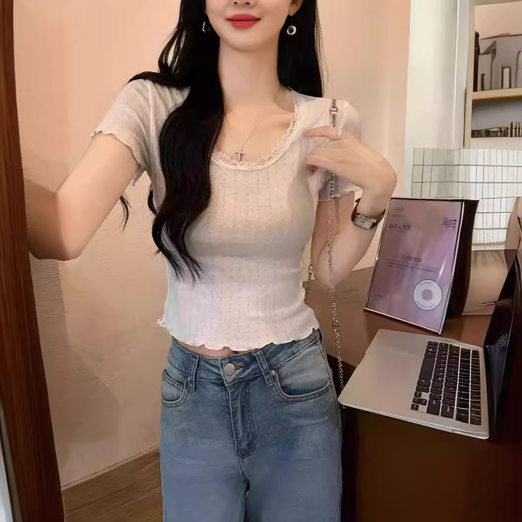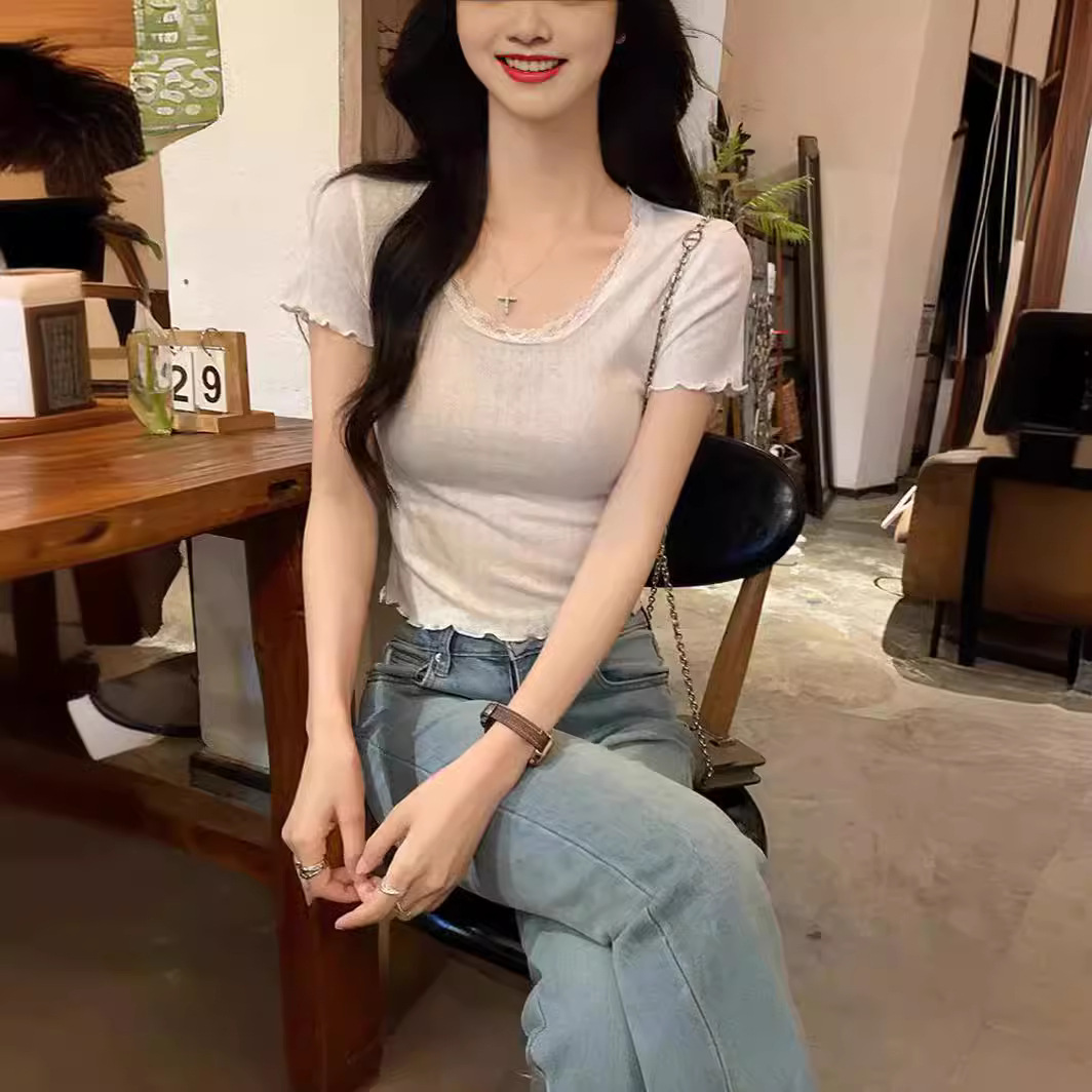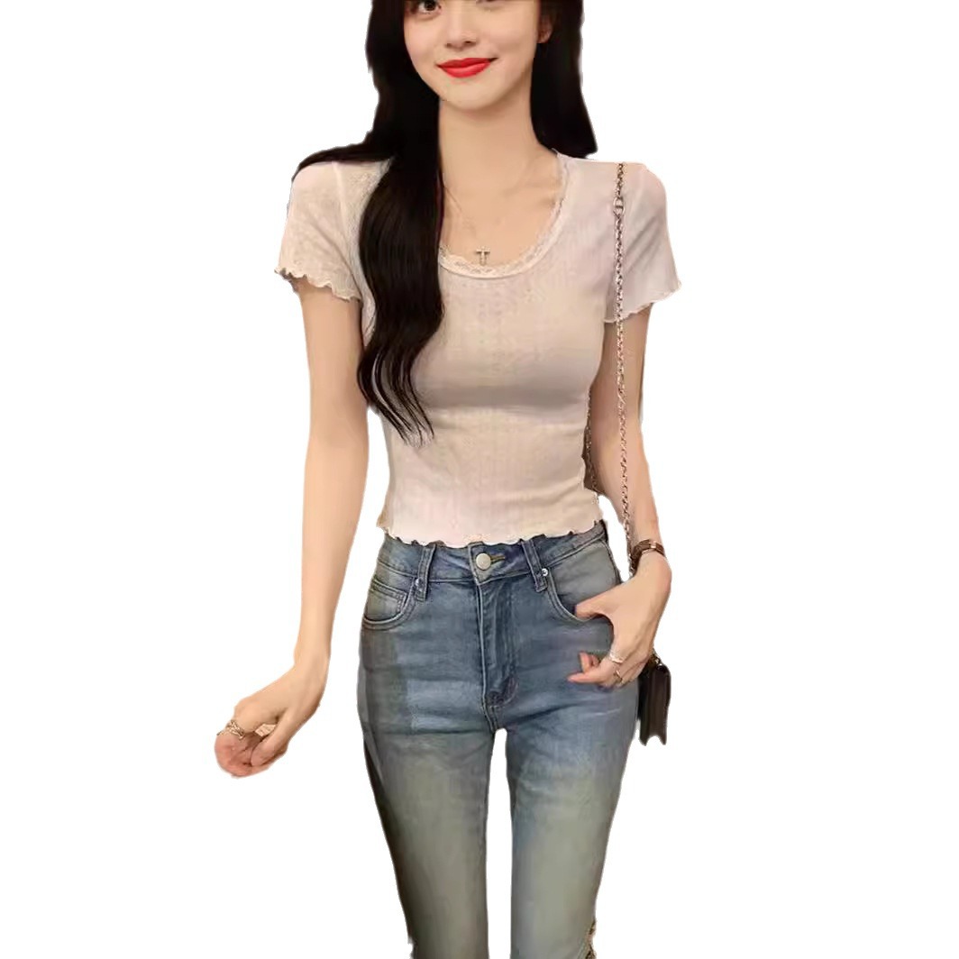 纯欲风蕾丝拼接短袖t恤女夏季修身显瘦设计感木耳边短款辣妹上衣