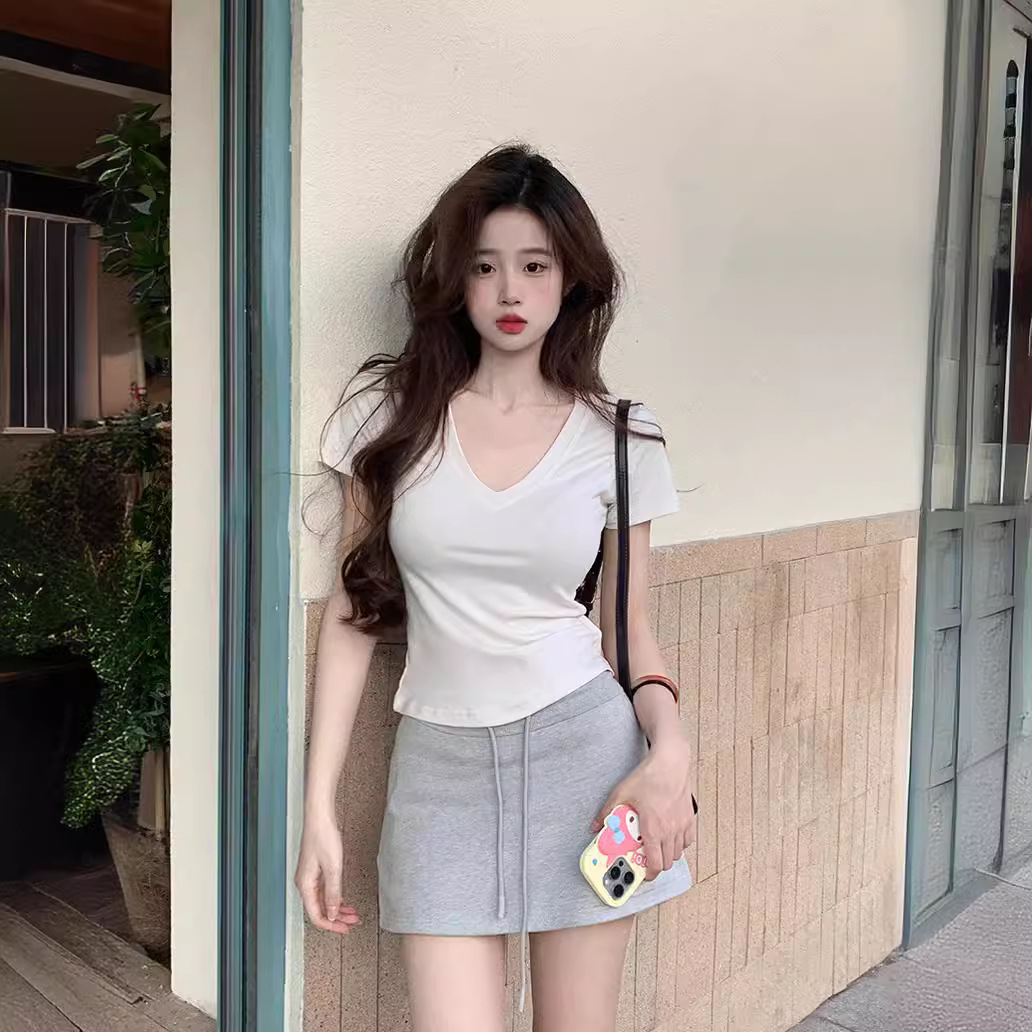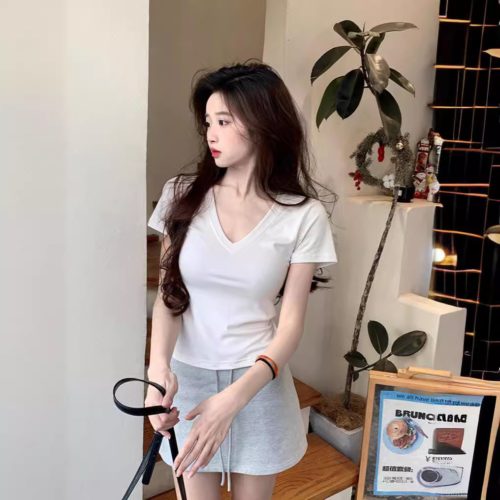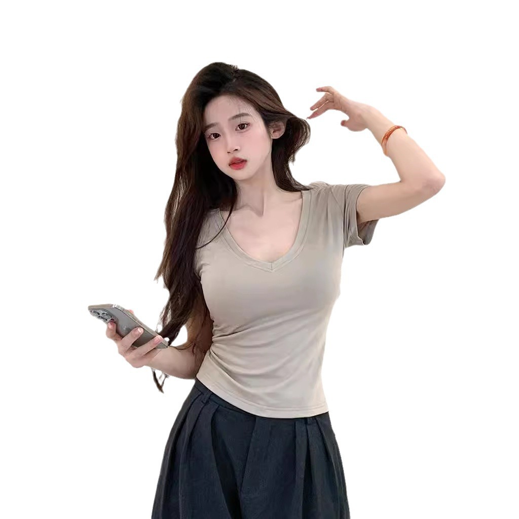 纯欲辣妹短袖T恤女夏季新款法式正肩短款打底修身锁骨简约上衣ins