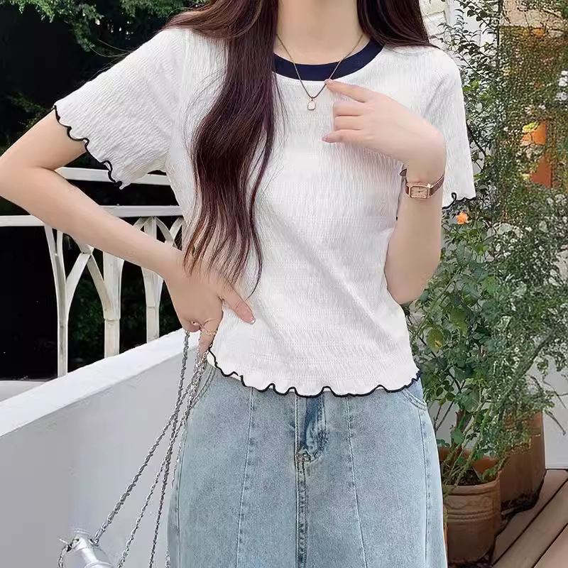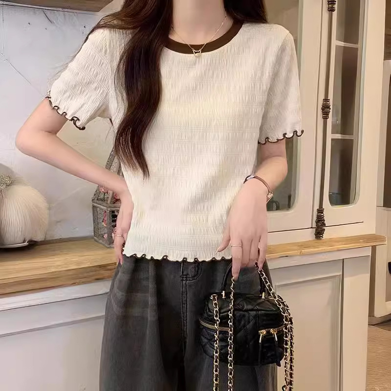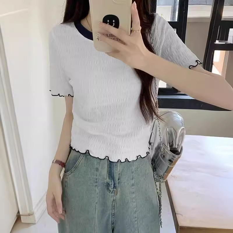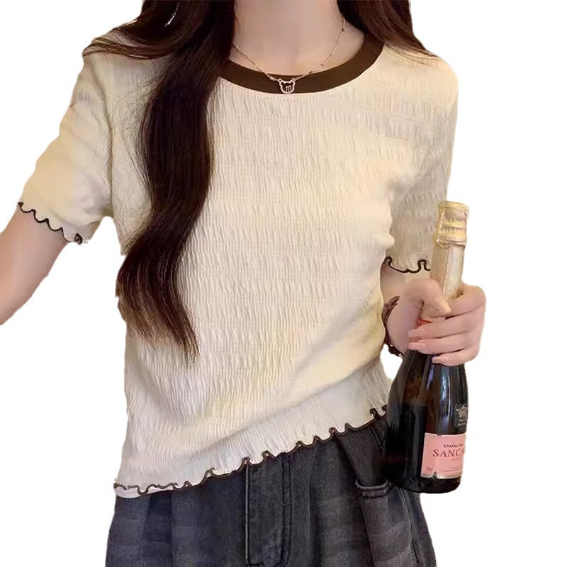 短袖正肩t恤女夏季法式小众木耳边独特显瘦别致雪纺衫上衣女短款