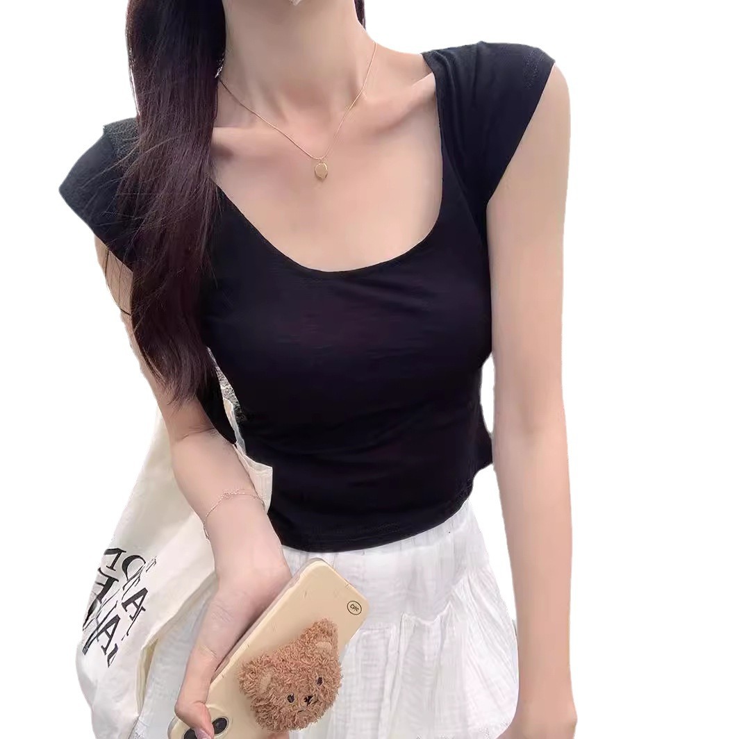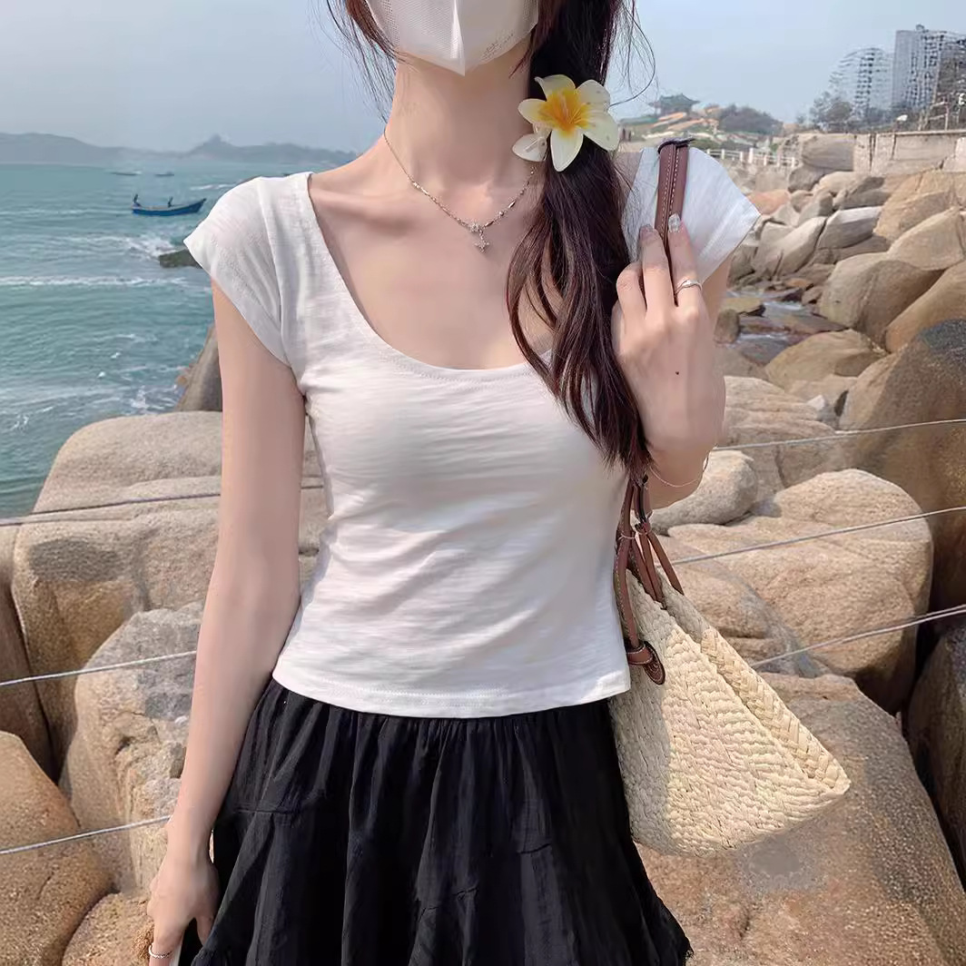 韩系修身显瘦U领纯色短袖T恤女夏季新款高腰法式短款打底上衣