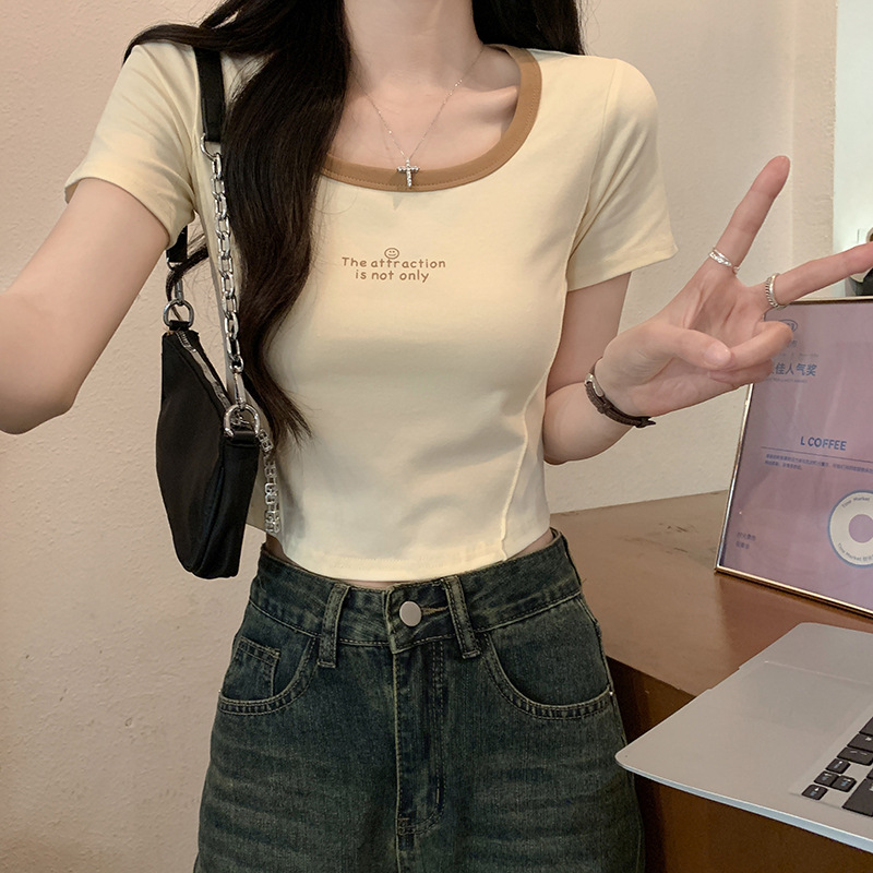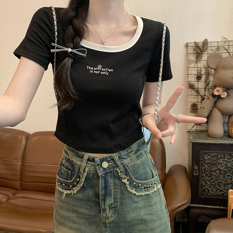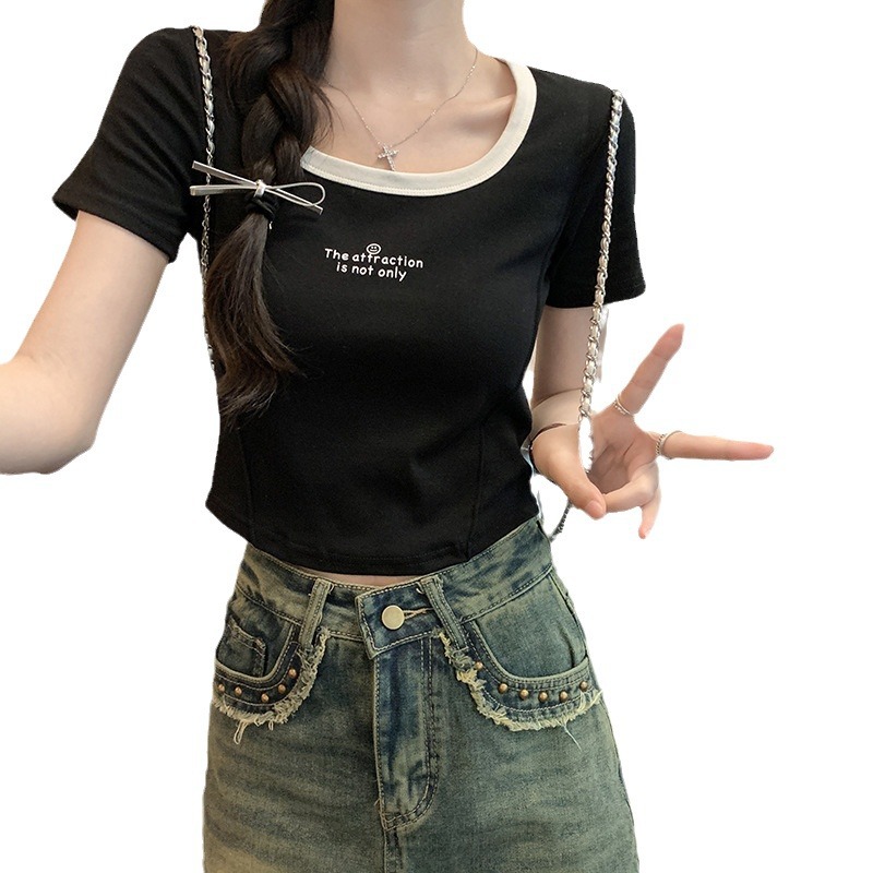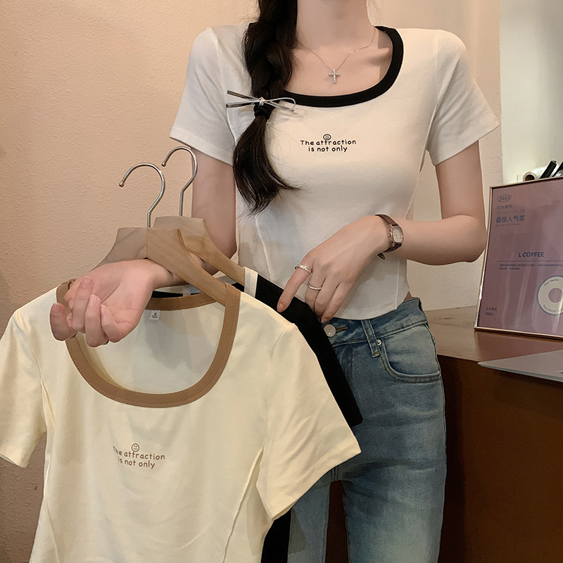 螺纹正肩方领短袖t恤女ins拼色纯欲辣妹修身显瘦锁骨短款鱼骨上衣