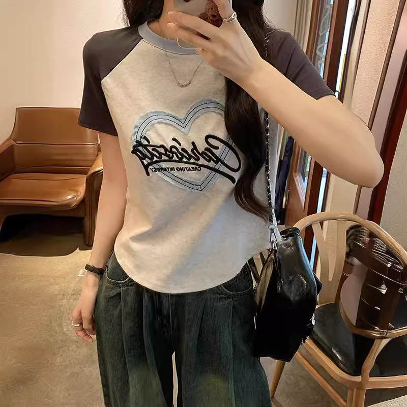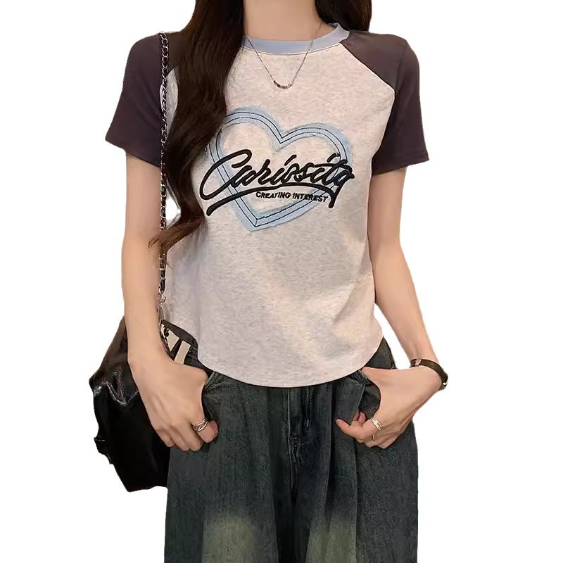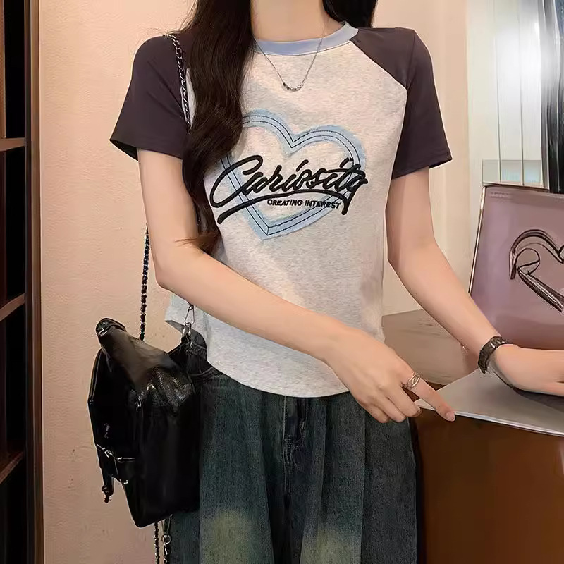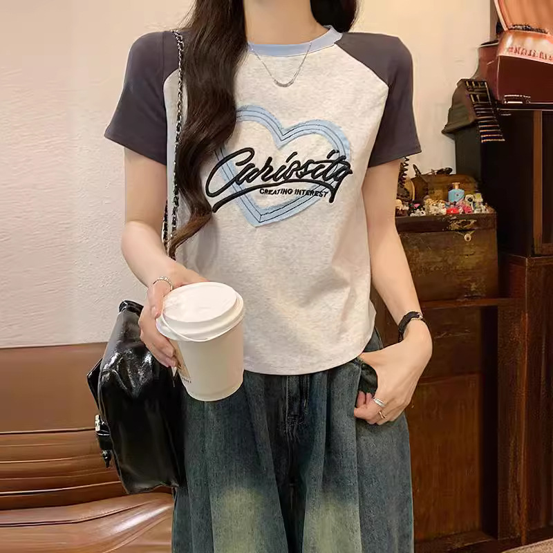 甜酷修身显瘦拼接撞色上衣女夏季新款短款短袖插肩袖内搭T恤