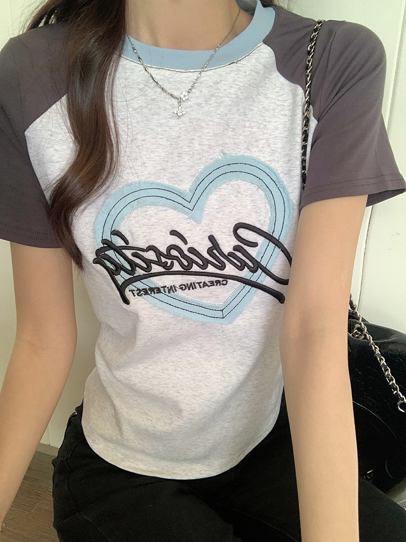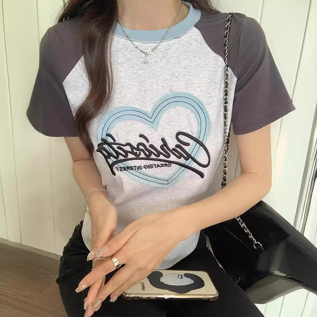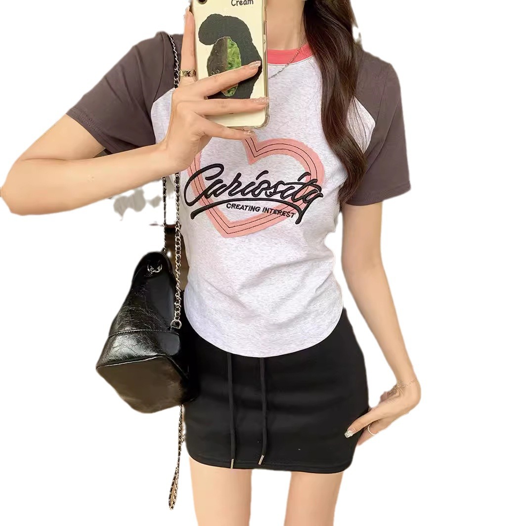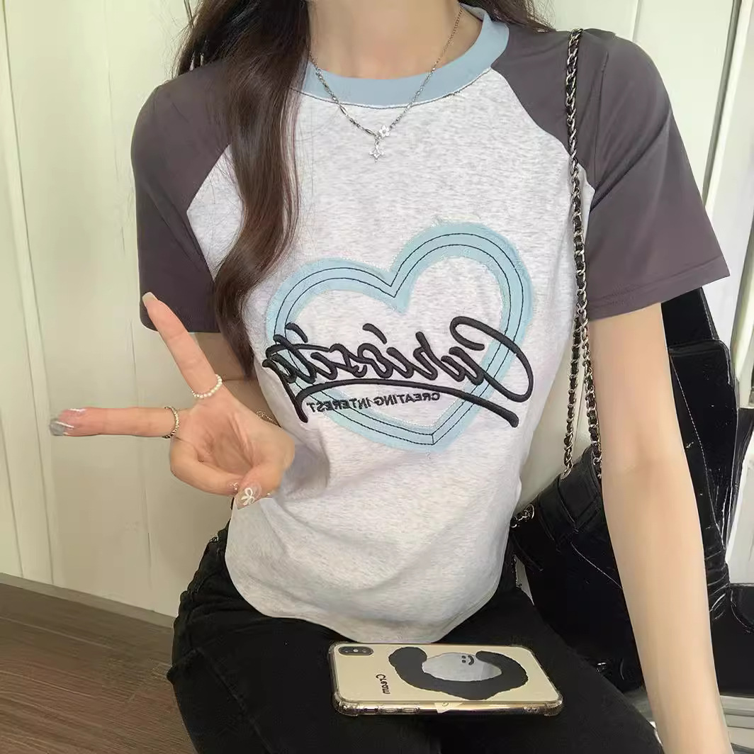 夏季新款撞色短袖t恤女美式设计感插肩袖修身正肩短款上衣ins甜美