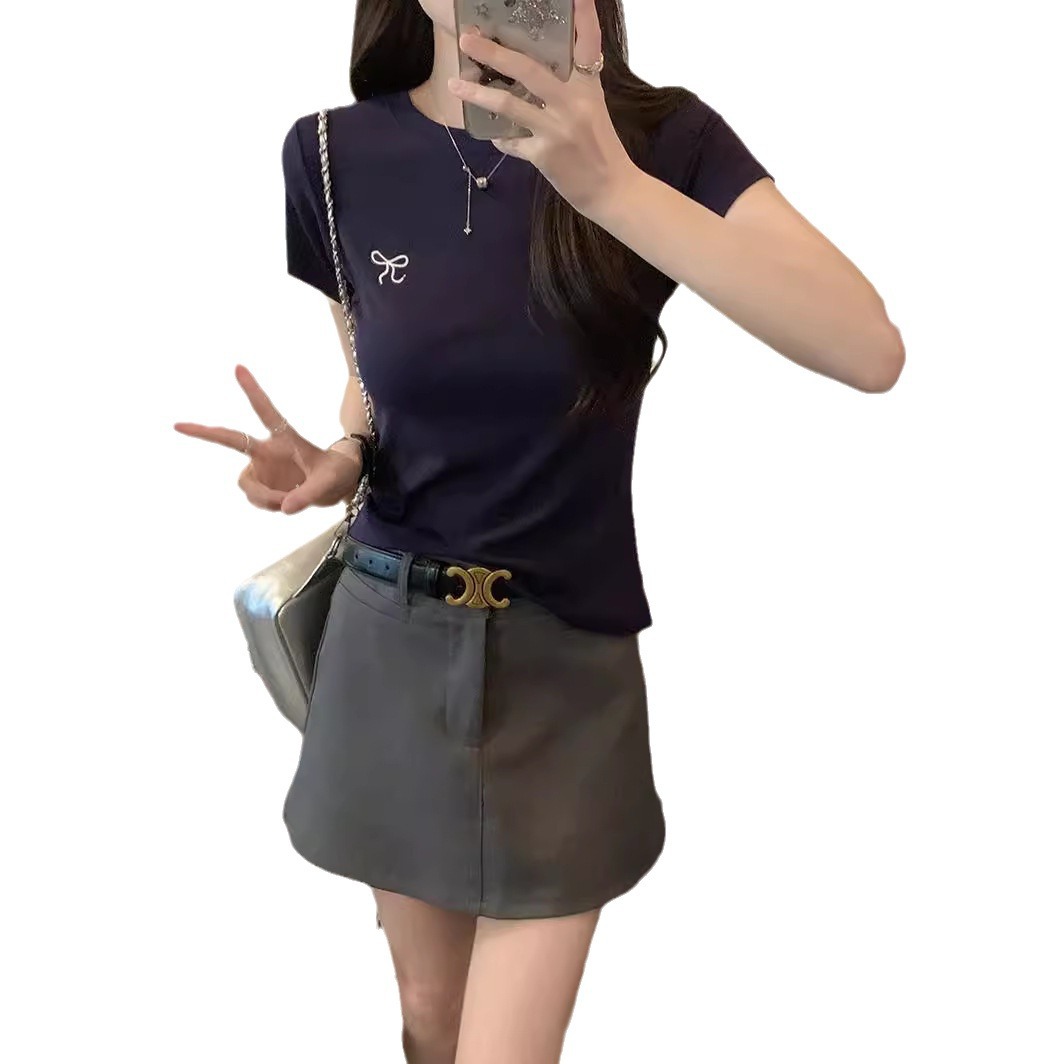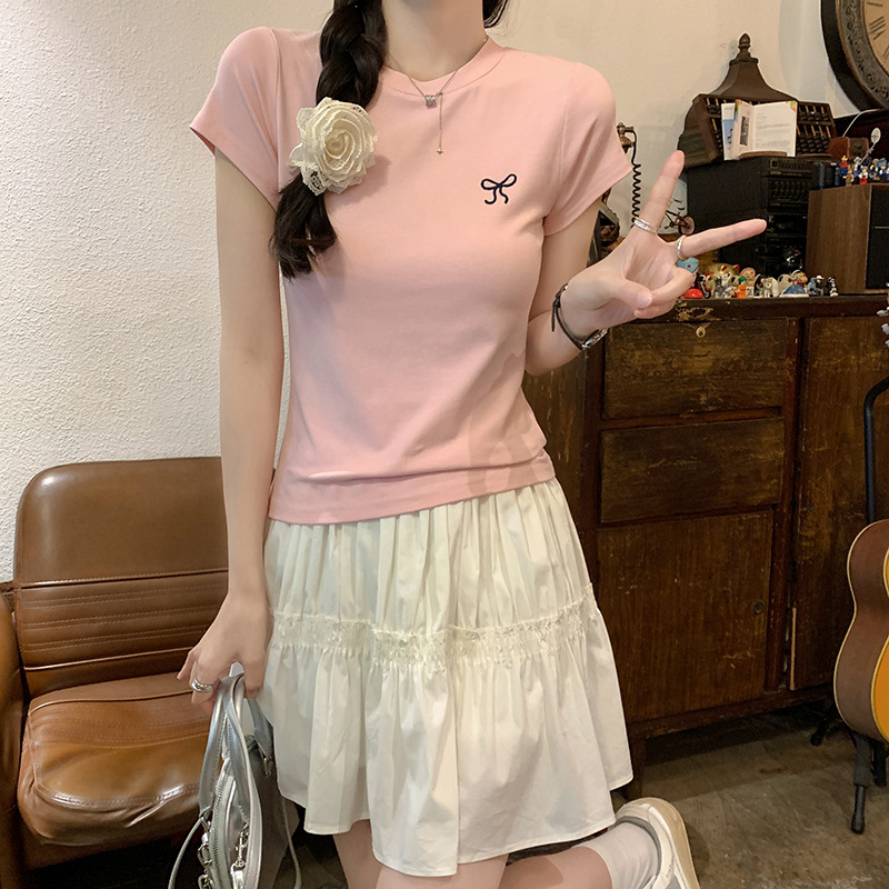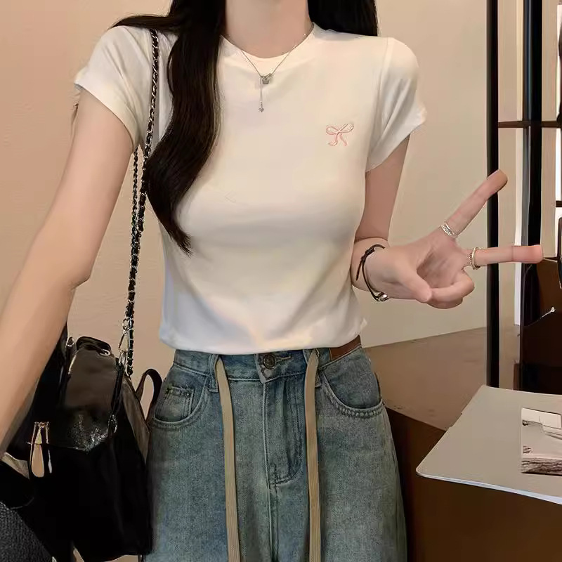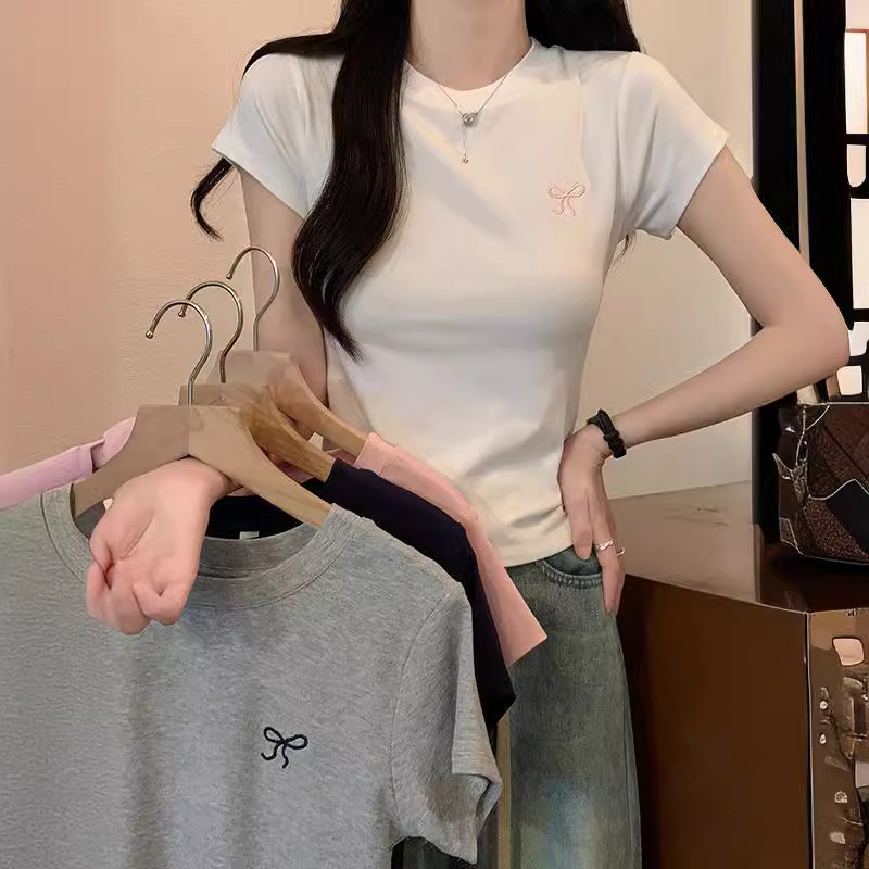 纯欲绝美设计感蝴蝶结圆领短袖T恤女夏季韩版正肩短款修身小上衣