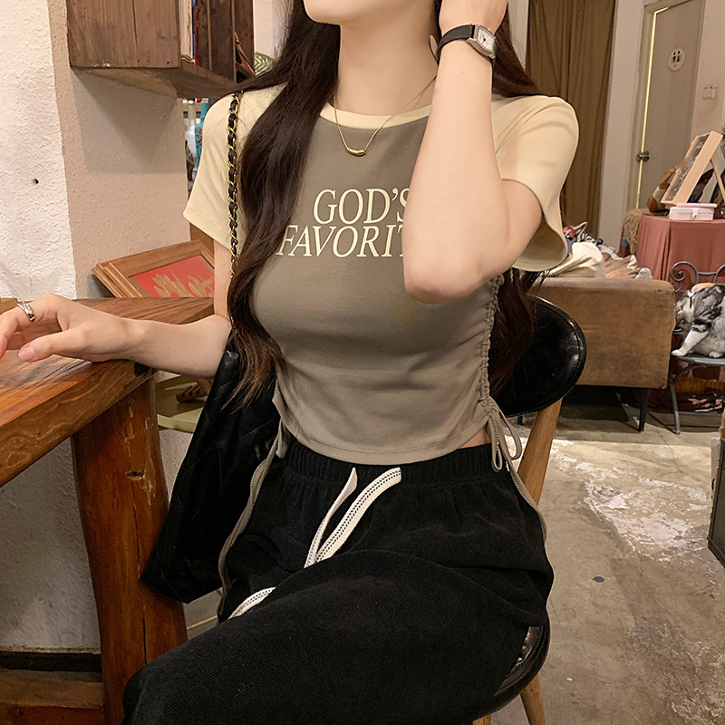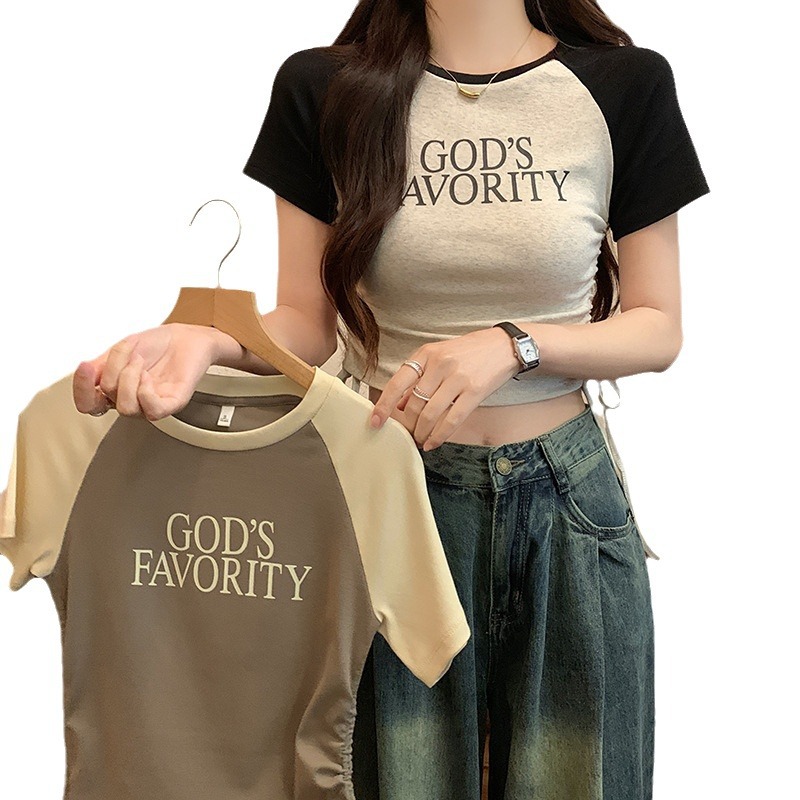 现货插肩袖字母印花圆领短袖T恤女夏季抽绳收腰短款辣妹上衣