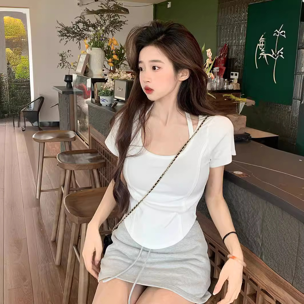 挂脖鱼骨设计感短袖T恤女夏季新款纯欲风短款不规则修身甜美上衣