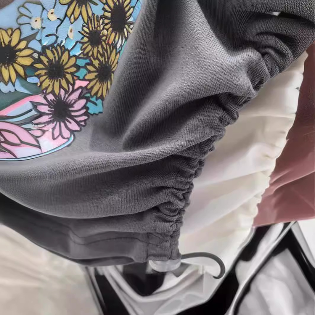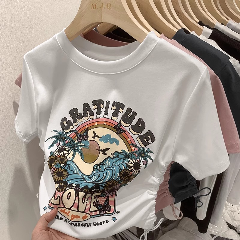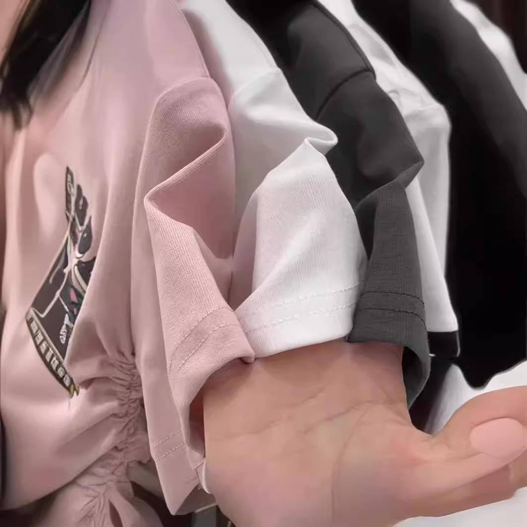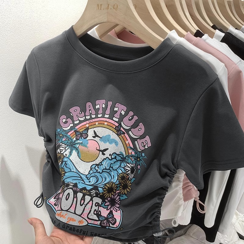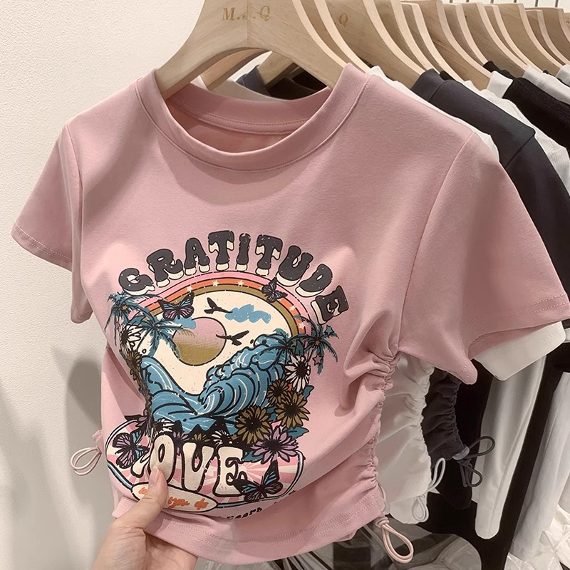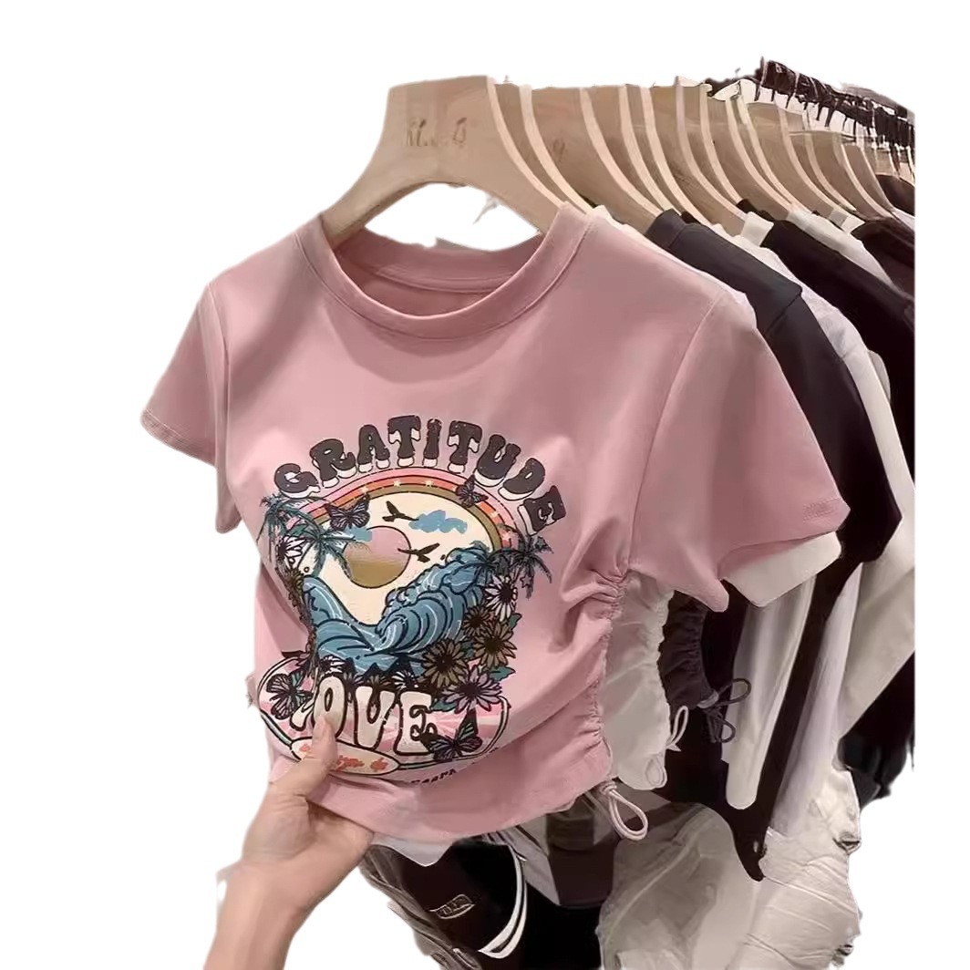 粉色抽绳短款正肩短袖t恤女夏季新款设计感小众修身欧货上衣