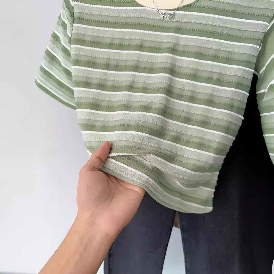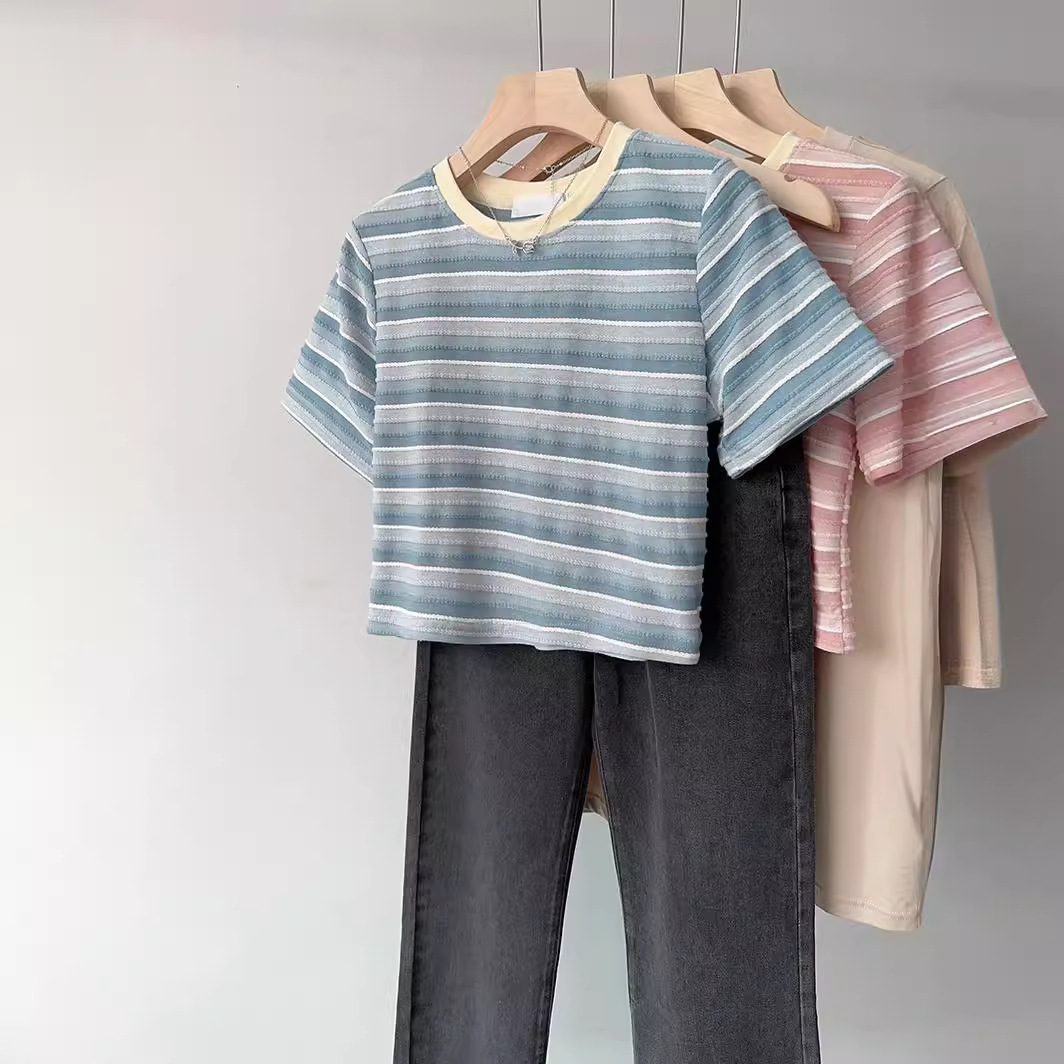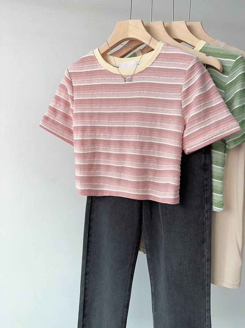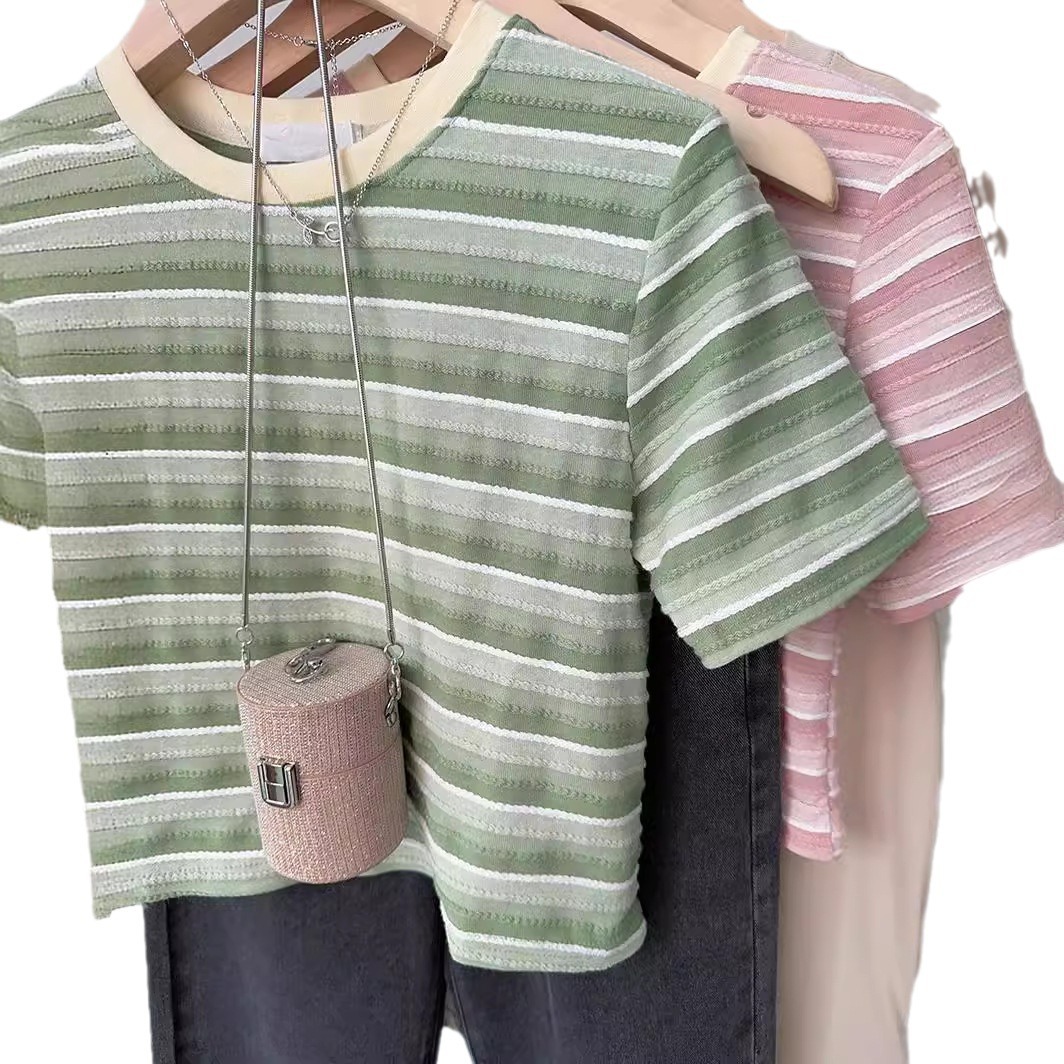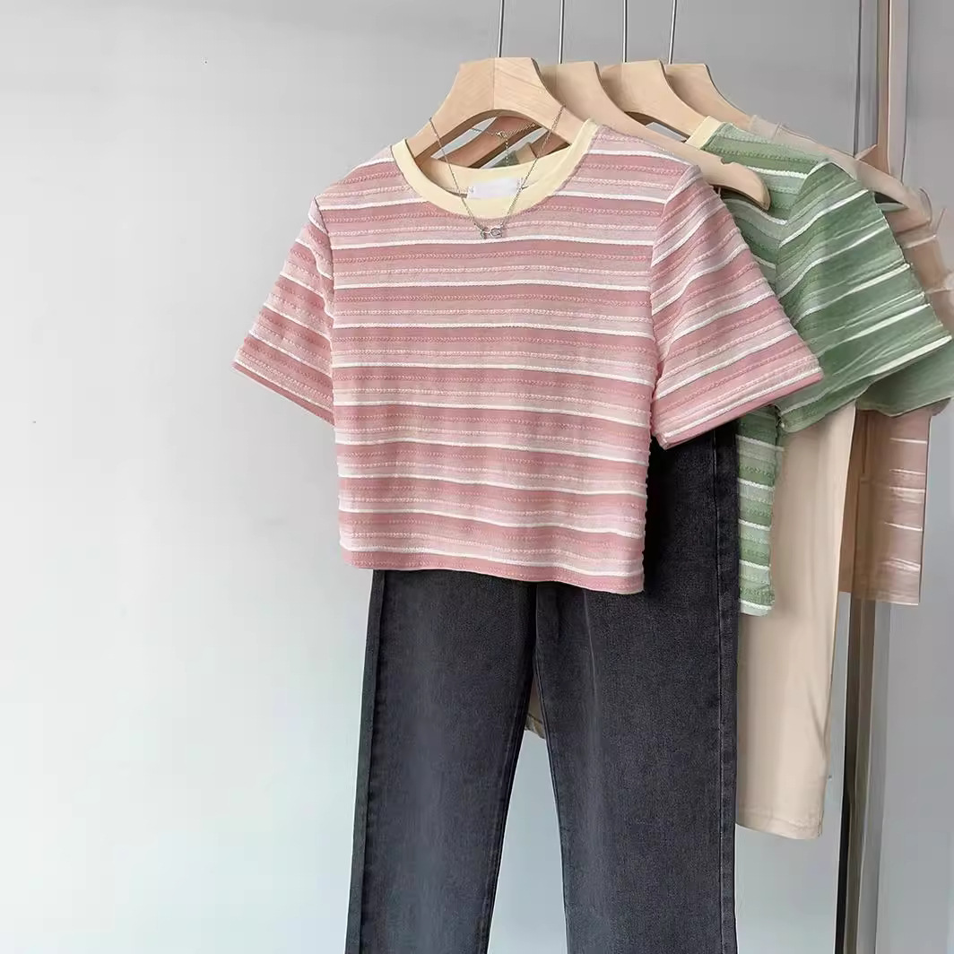 立体编织纹撞色条纹短袖T恤女春夏高腰短款宽松休闲复古小衫上衣