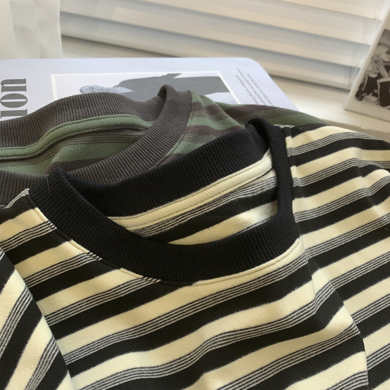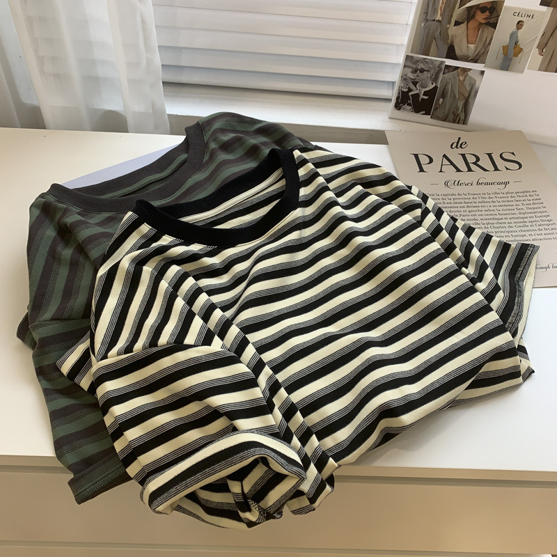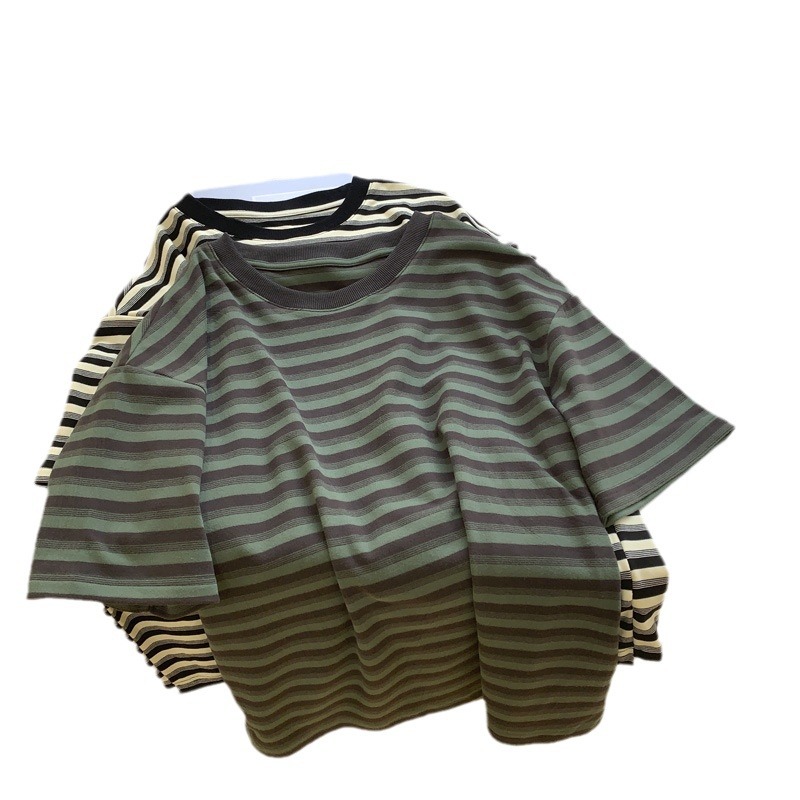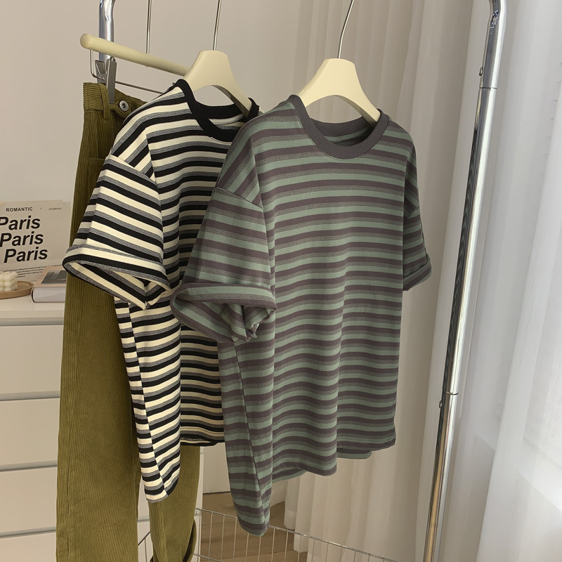 复古绿色条纹短袖t恤女宽松大码慵懒风打底衫上衣年夏季新款