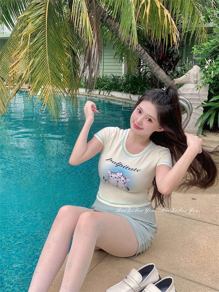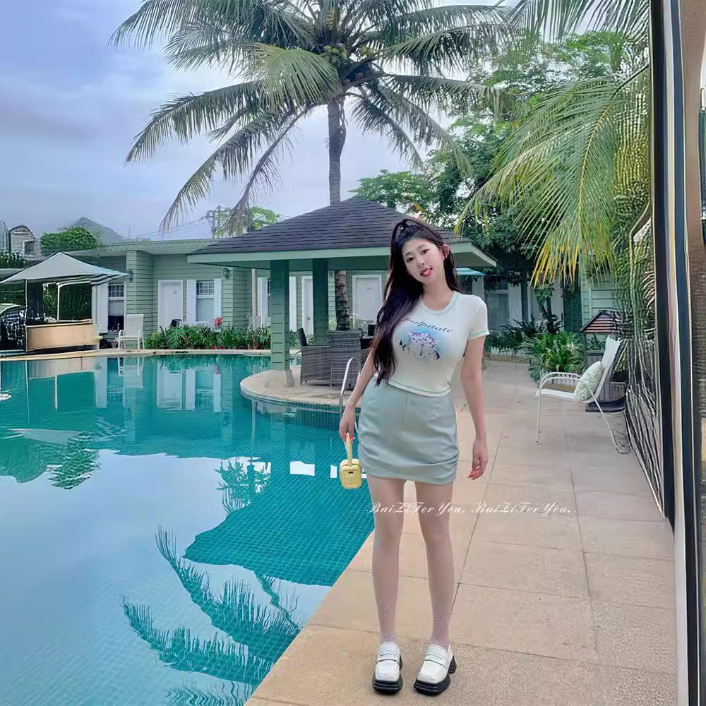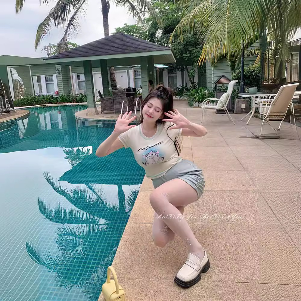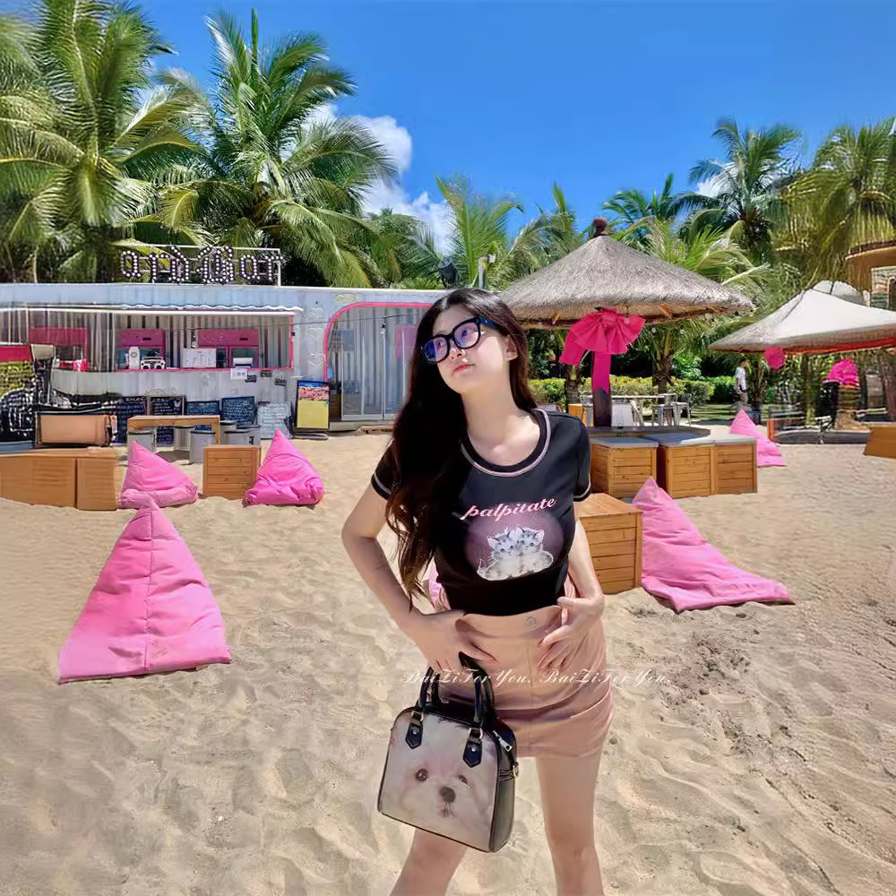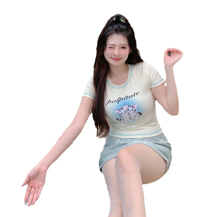 纯欲风棉设计短袖喵喵印花t恤女夏季新款收腰纯欲显瘦短上衣ins