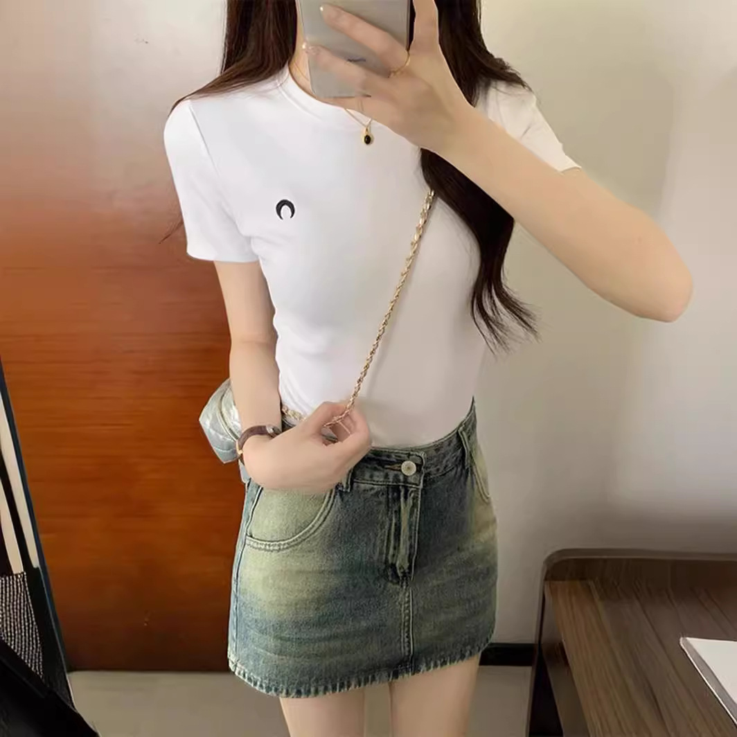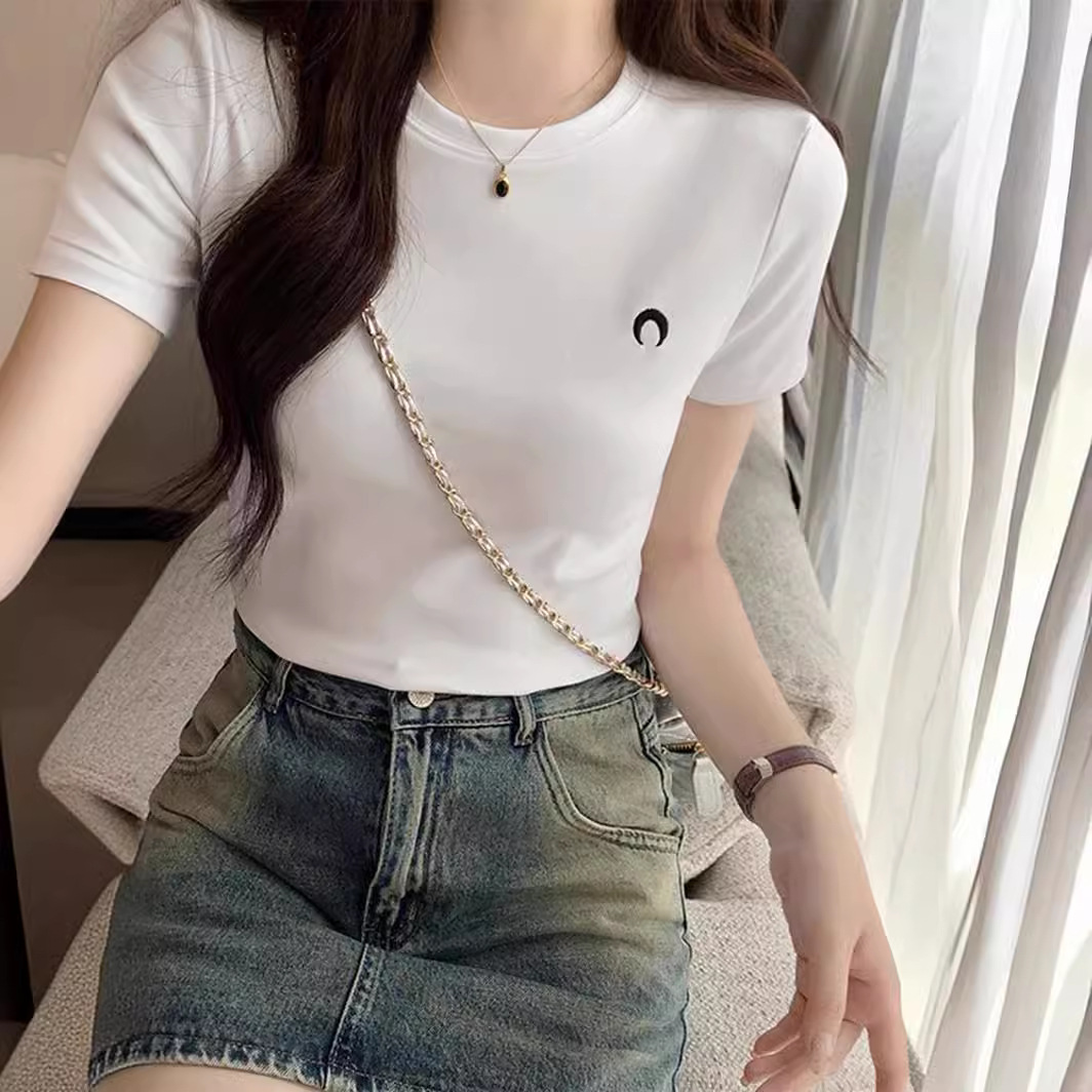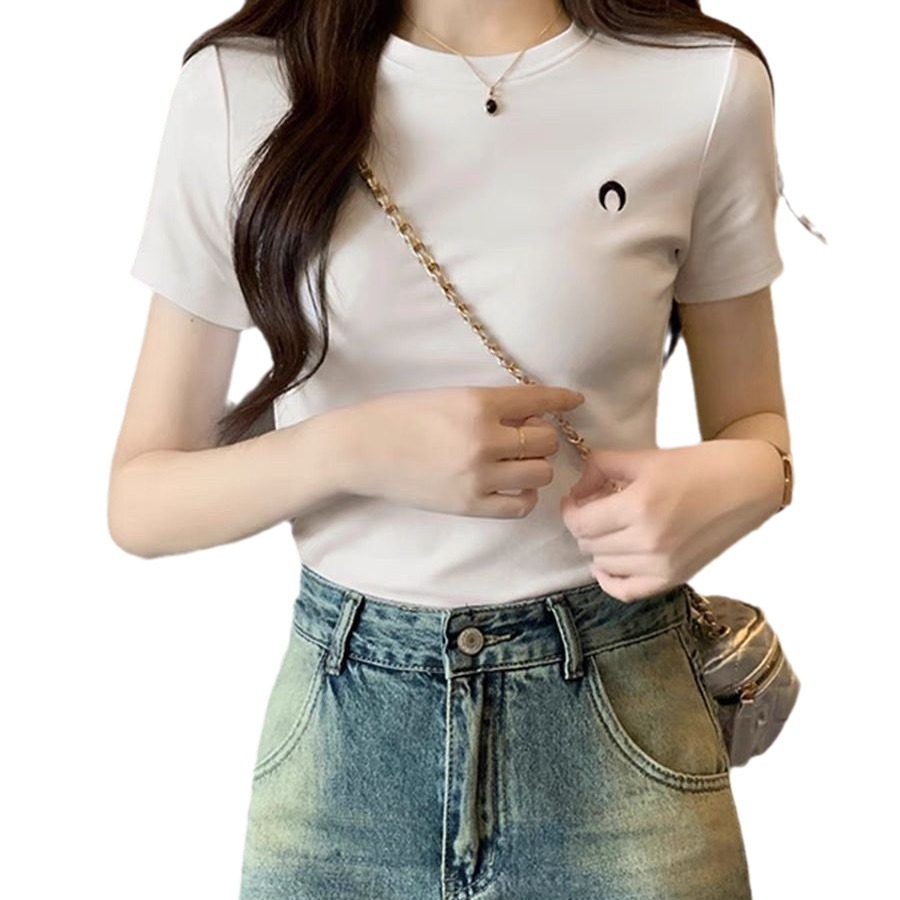 白色圆领正肩短袖t恤女夏季新款纯欲风刺绣修身显瘦辣妹内搭上衣