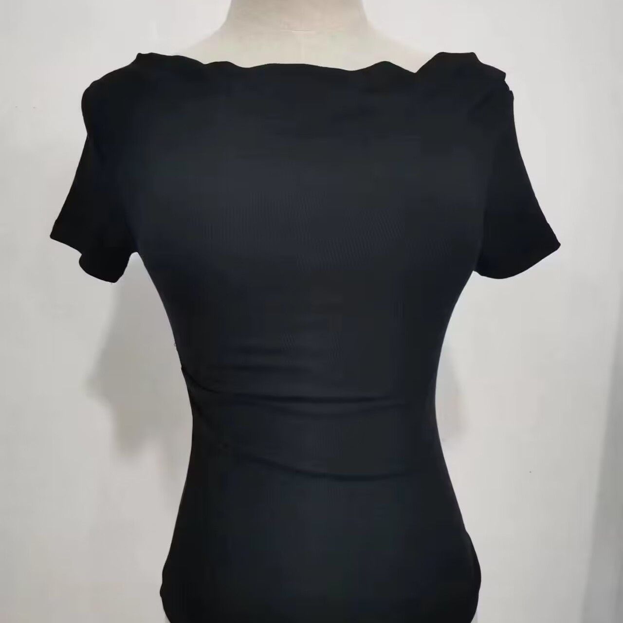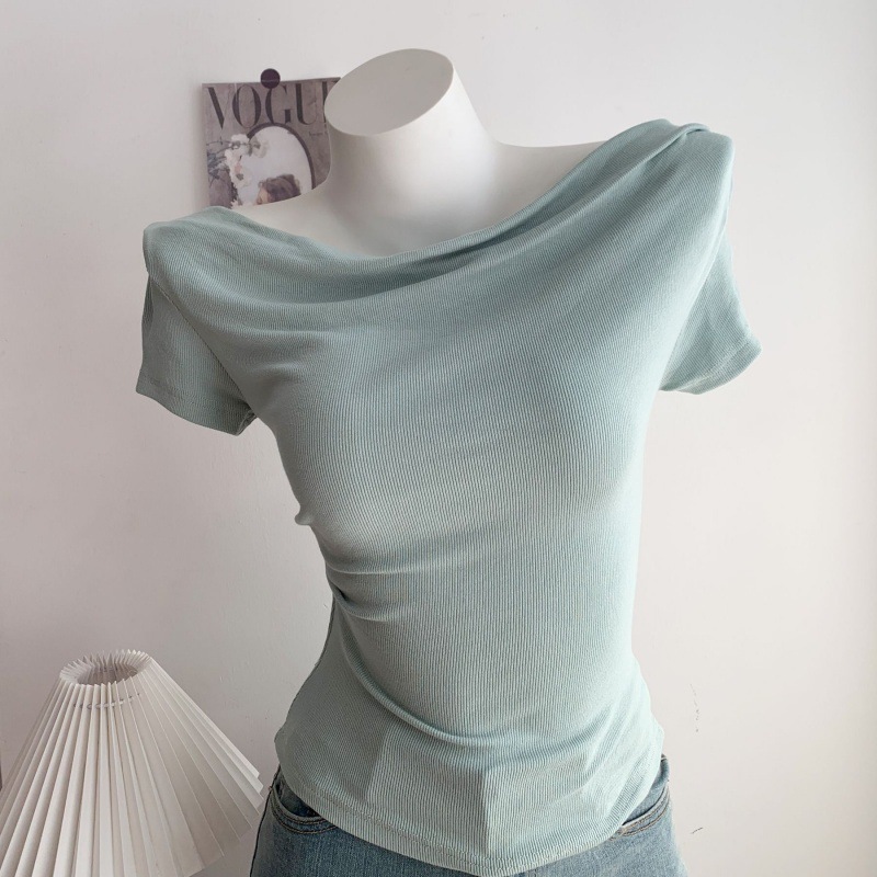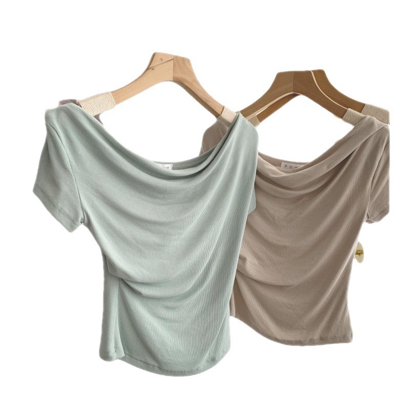 夏季褶皱不规则螺纹露肩荡领短袖T恤小众设计感纯欲辣妹上衣
