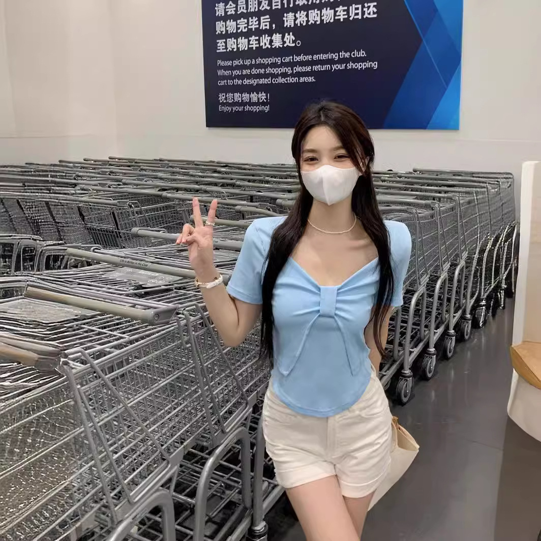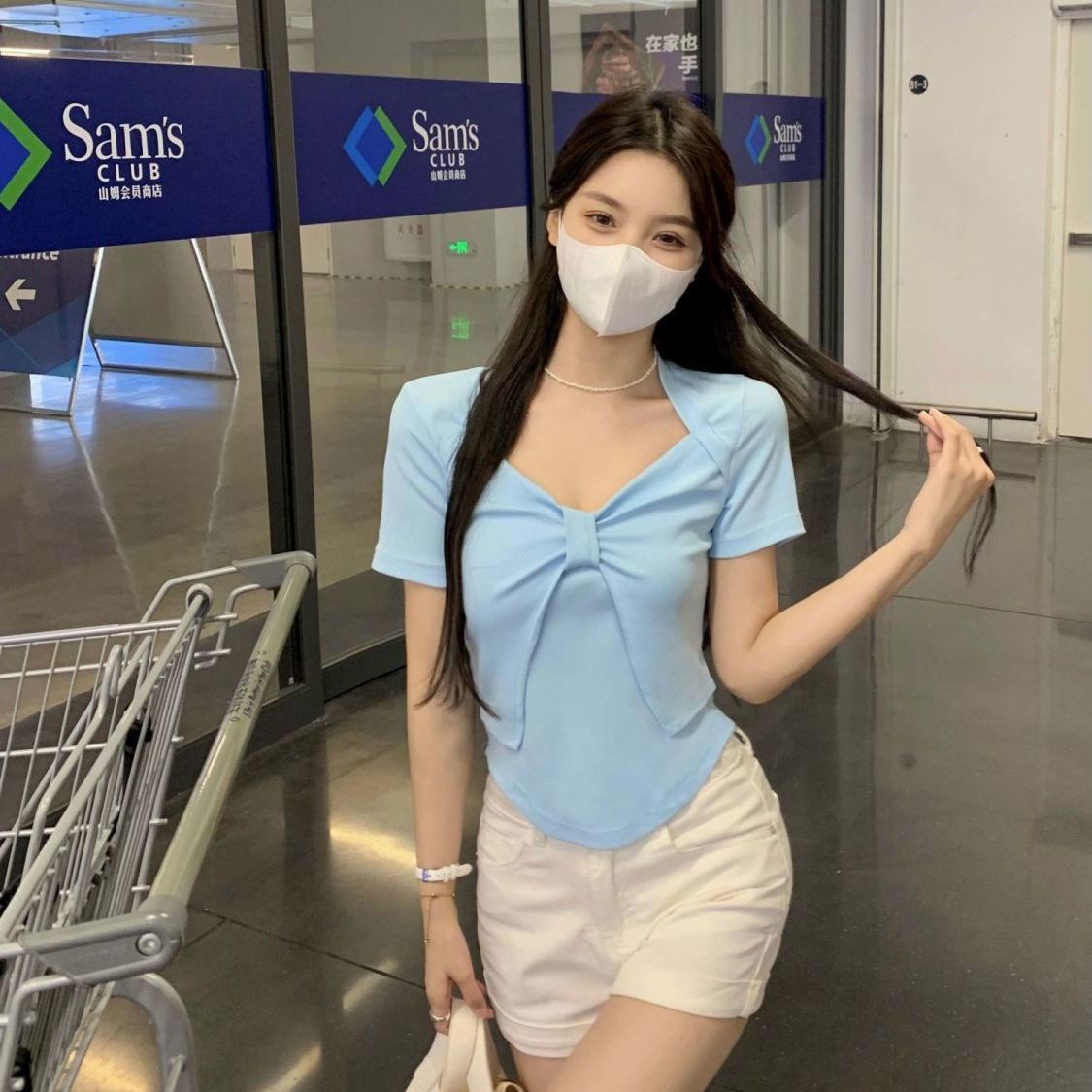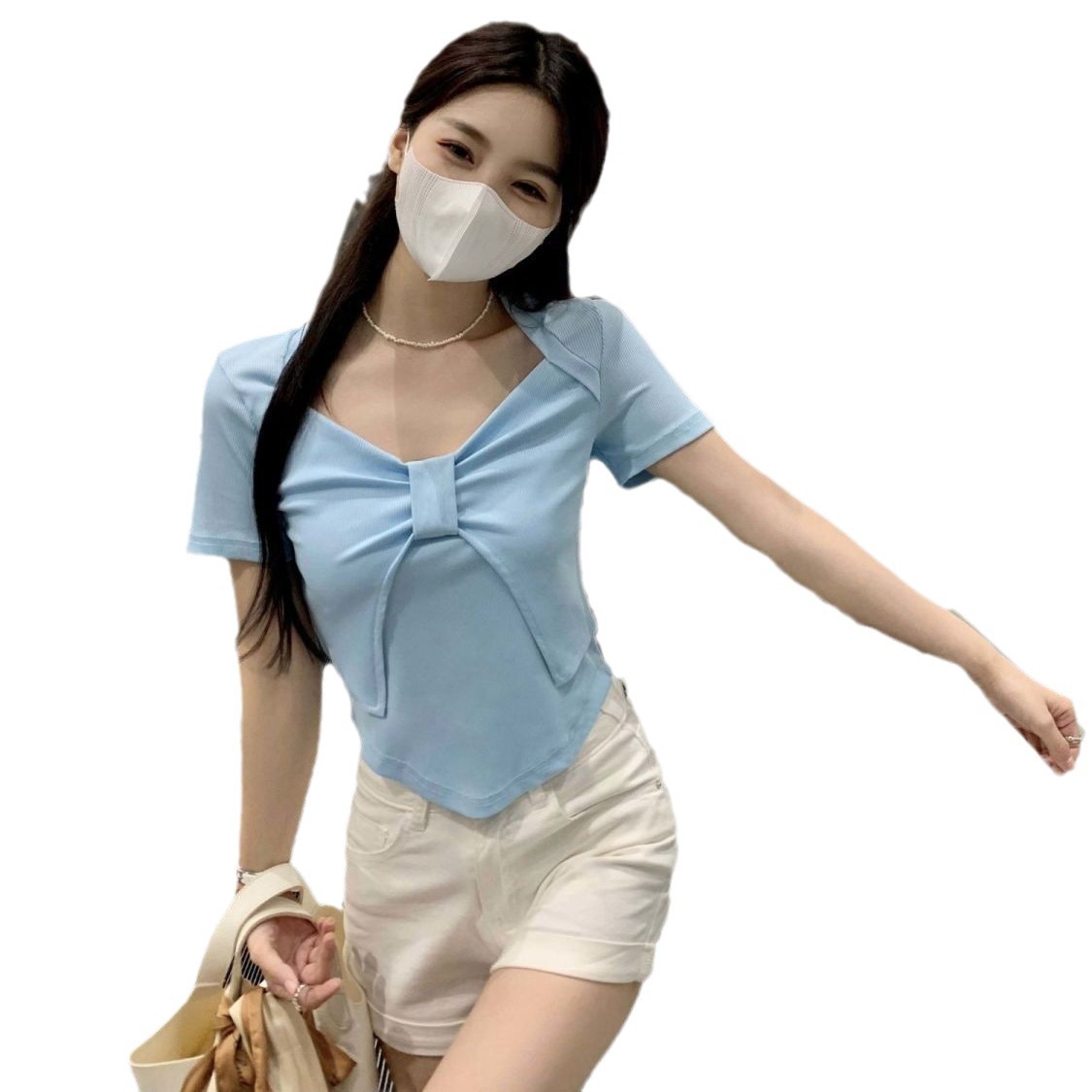 夏季新款纯欲蝴蝶结上衣女方领显瘦短袖设计感小众纯色正肩t恤ins