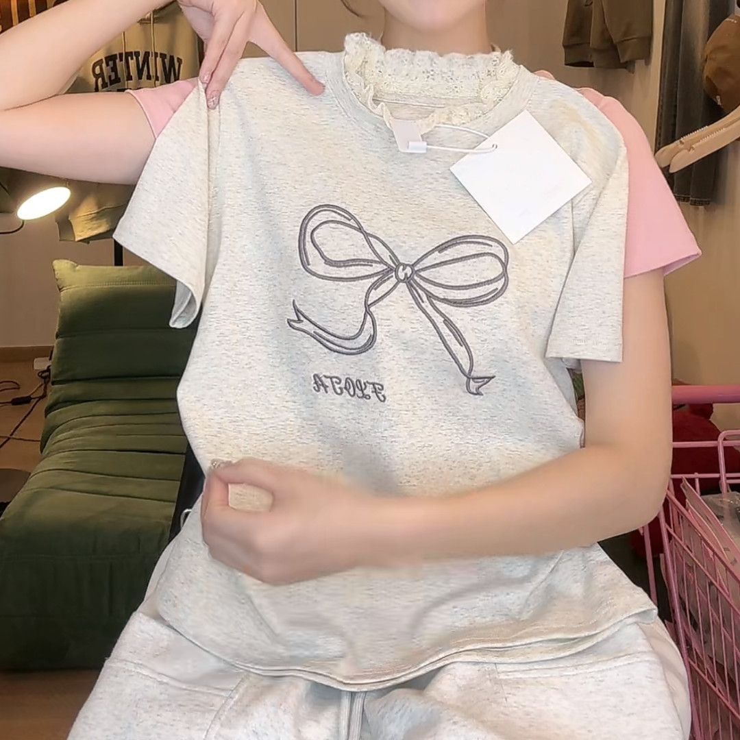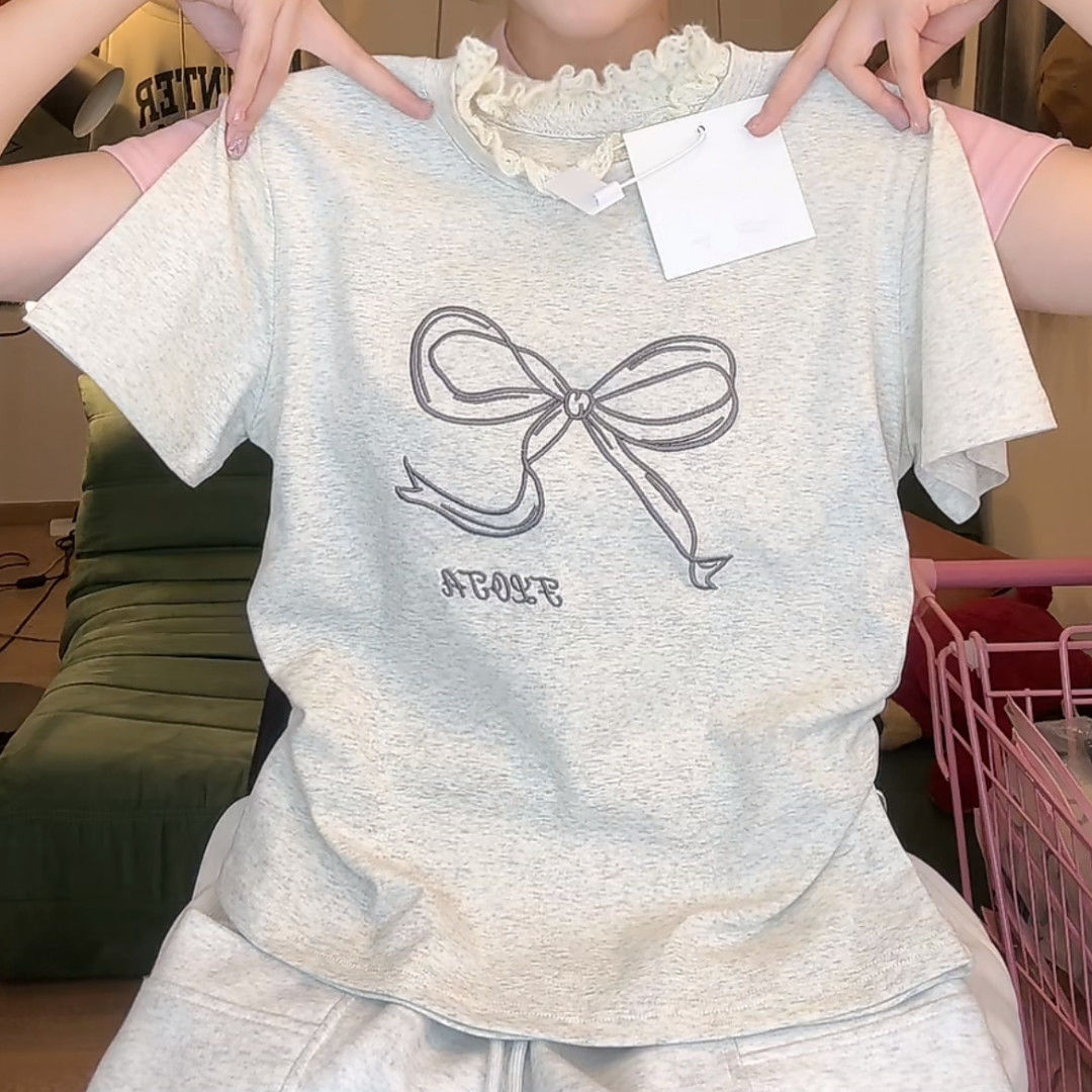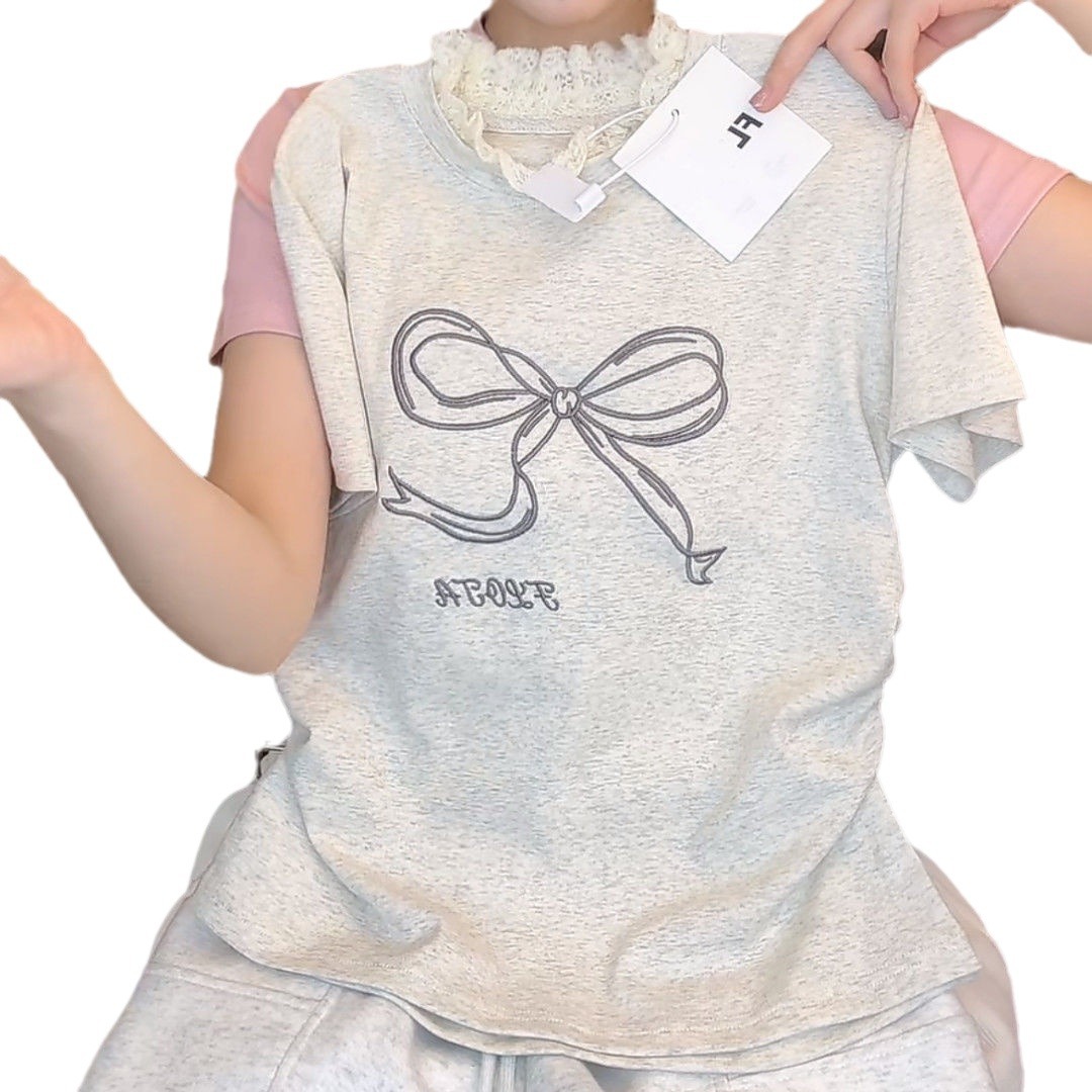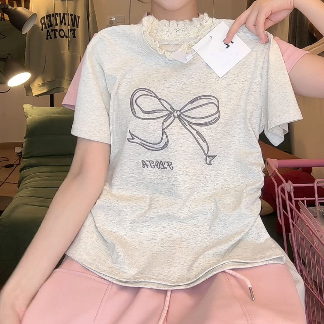 花灰色刺绣蝴蝶结拼接蕾丝短袖T恤新款显瘦修身百搭小个子上衣女