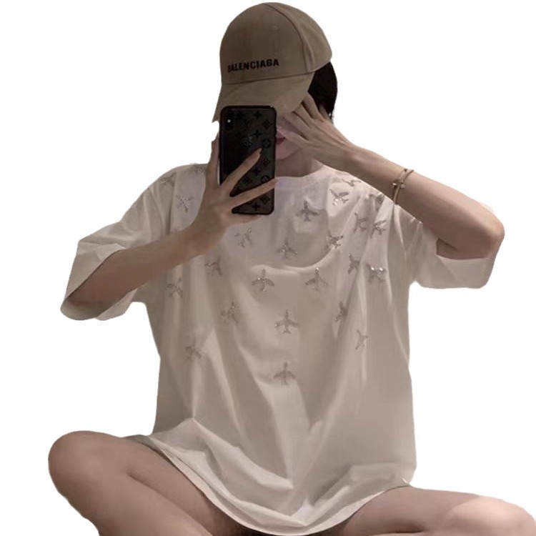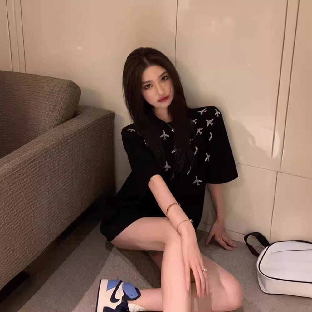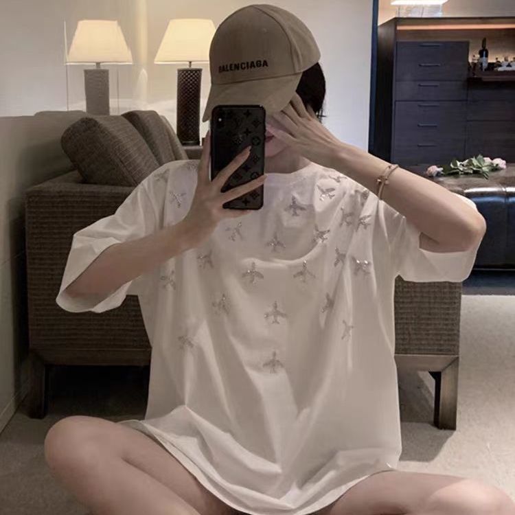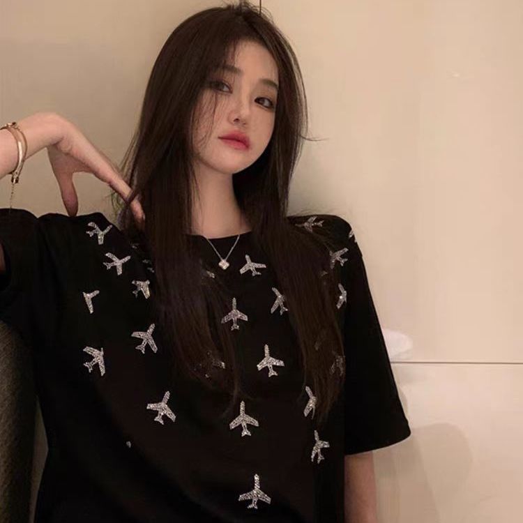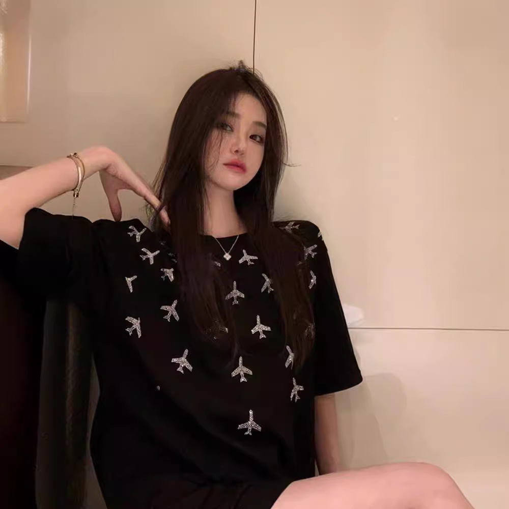 纯棉chic外穿气质小众特色设计款飞机烫钻百搭情侣款短袖T恤
