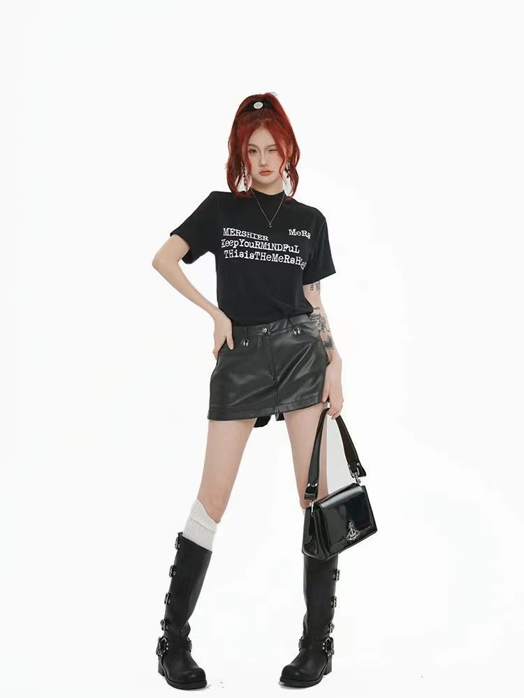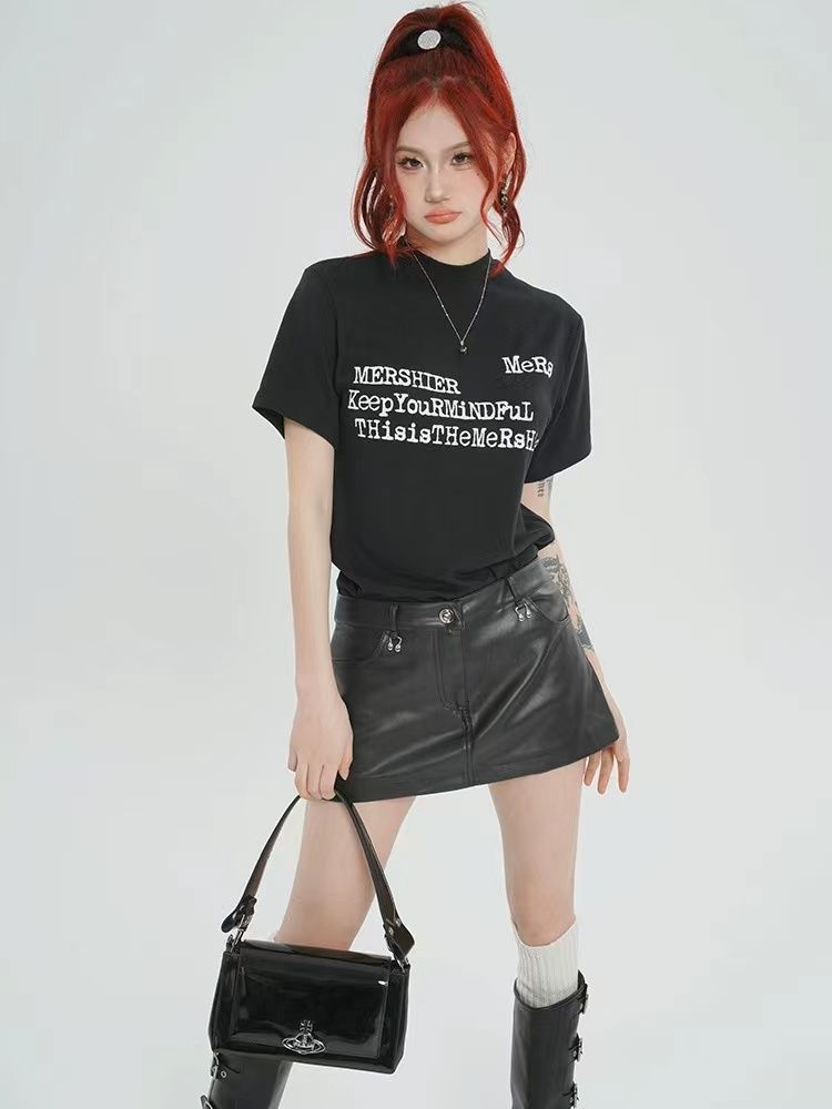 美式辣妹黑色正肩短袖T女夏季多巴胺穿搭不对称个性别致短款上衣