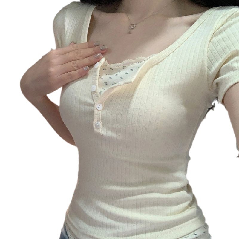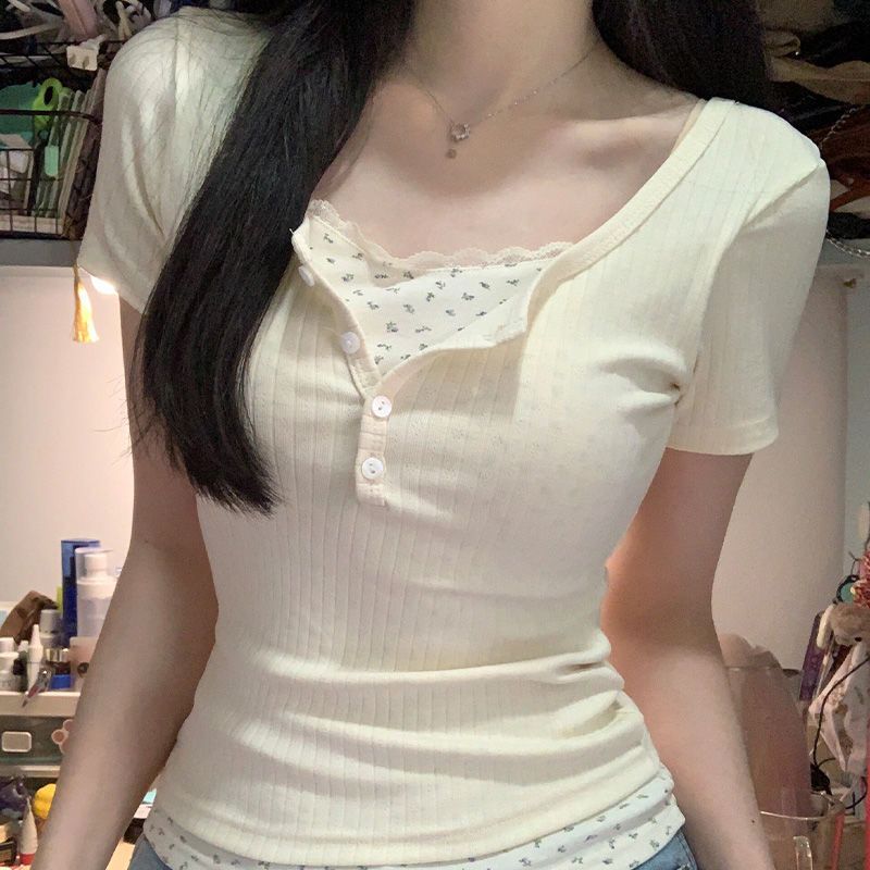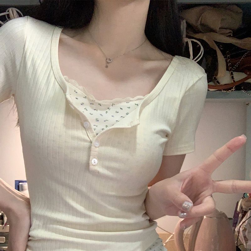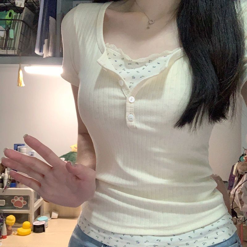 碎花蕾丝花边短袖t恤女春夏假两件纯欲辣妹bm正肩上衣内搭打底衫