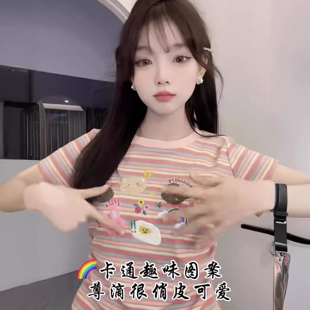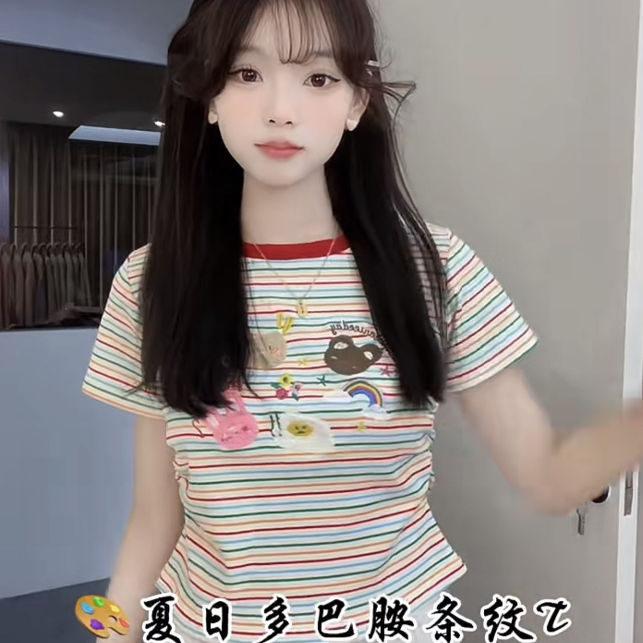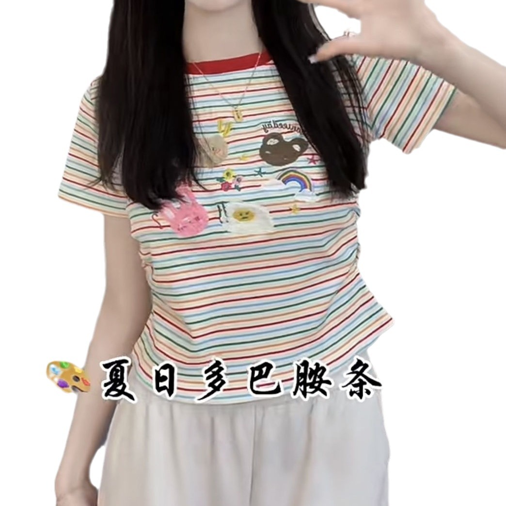 多巴胺彩虹条纹T恤女刺绣卡通短袖撞色圆领甜妹收腰短款修身上衣