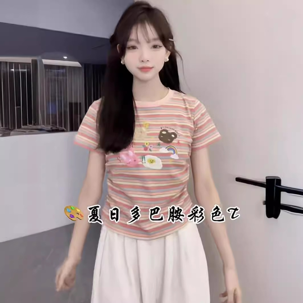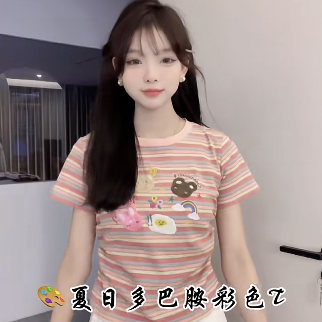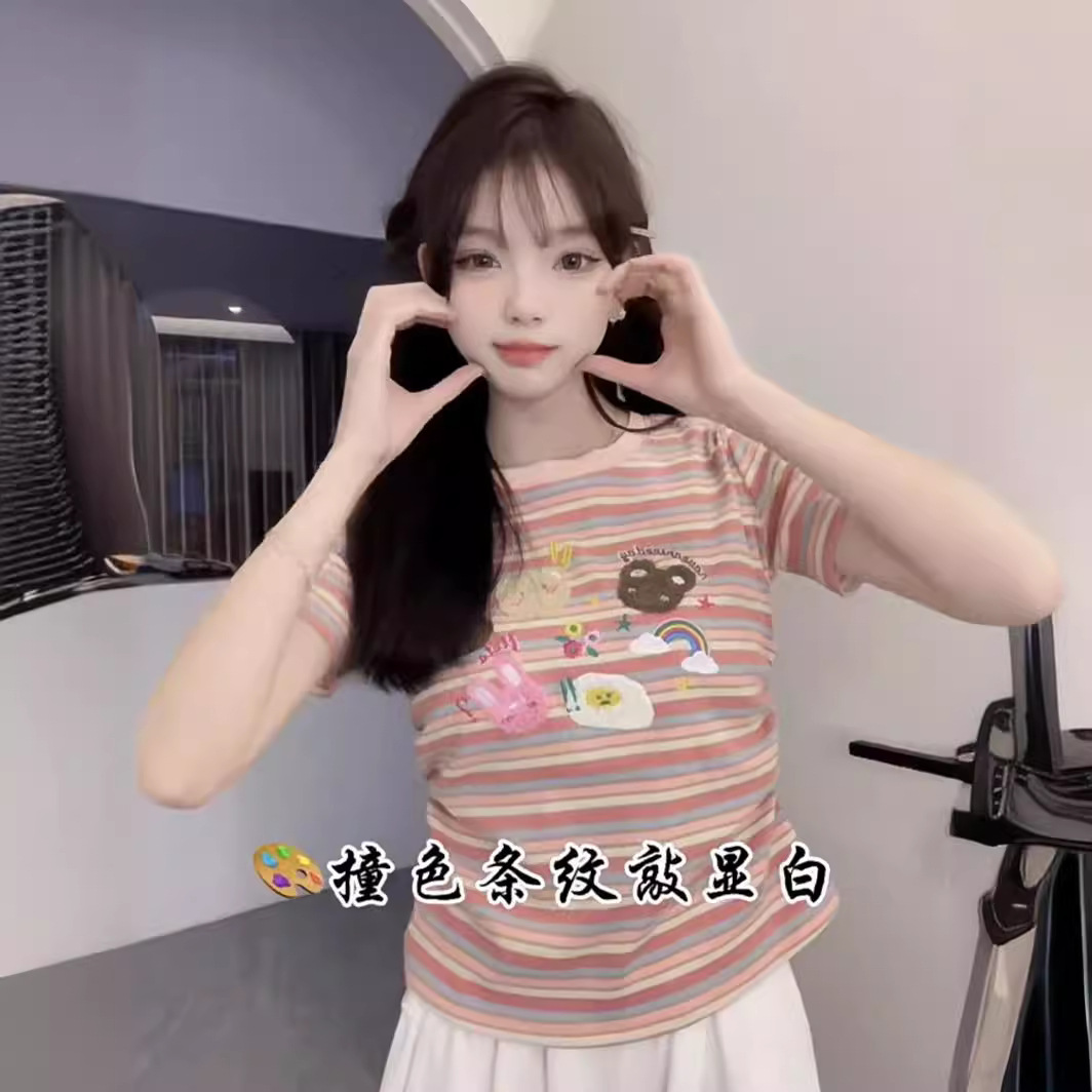 多巴胺彩虹条纹T恤女刺绣卡通短袖撞色圆领甜妹收腰短款修身上衣