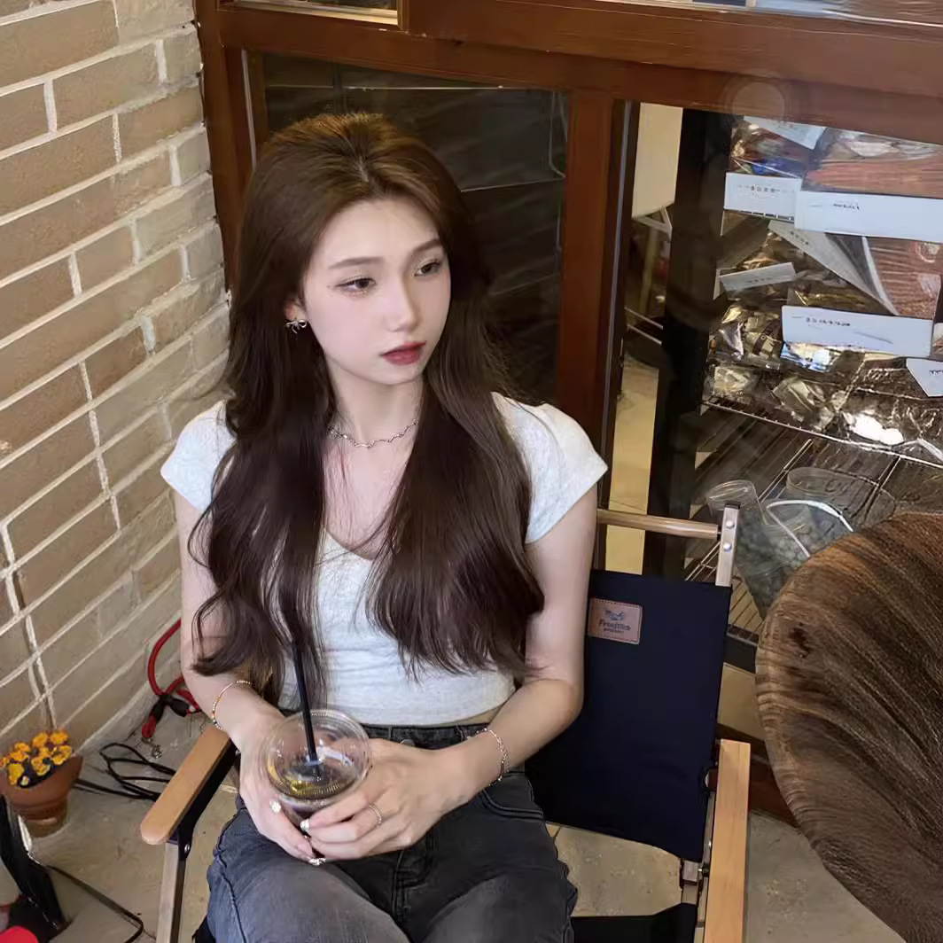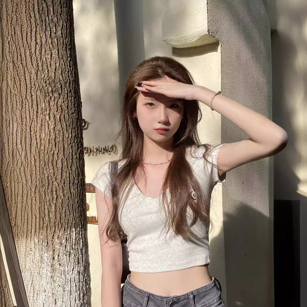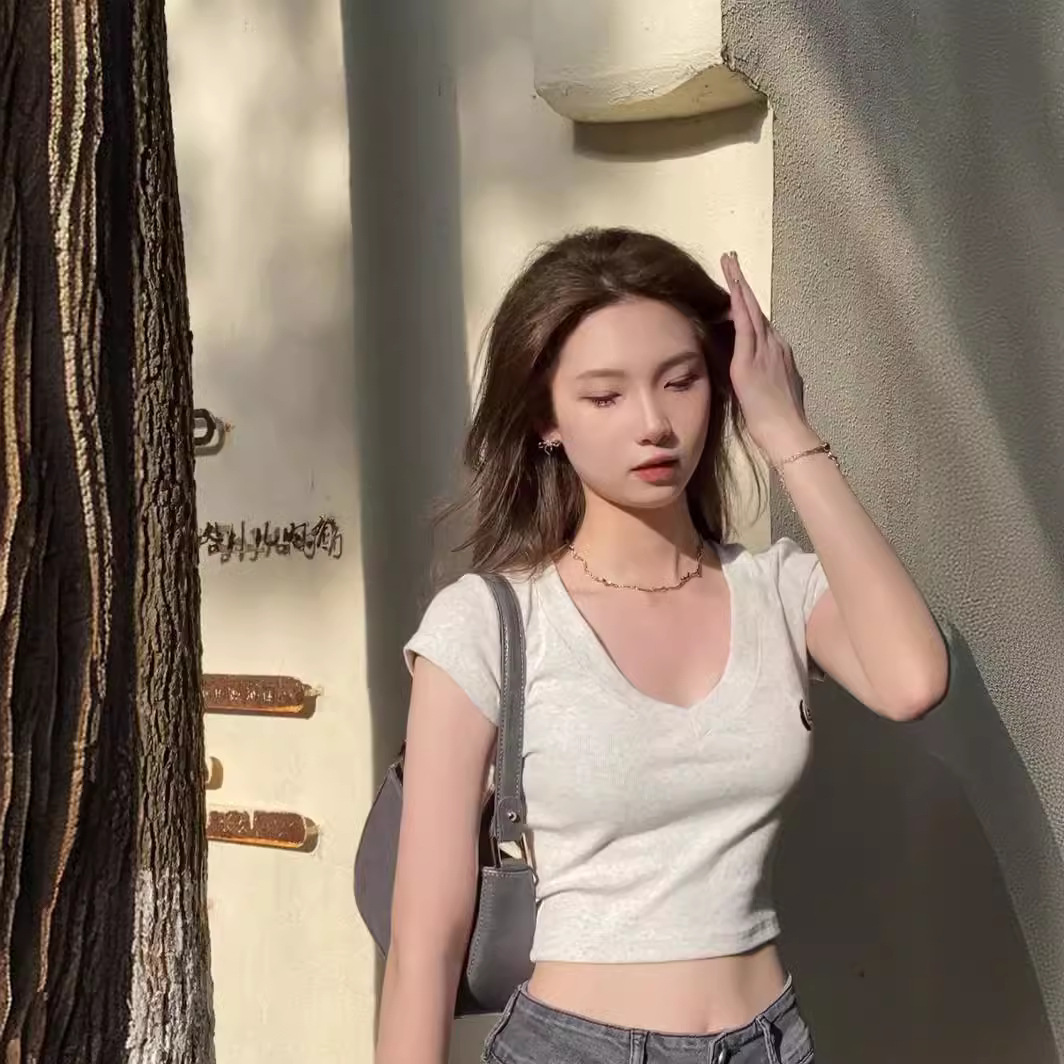 V领绣花甜辣妹夏季新款短款莫代尔上衣短袖t恤女修身百搭显瘦高腰