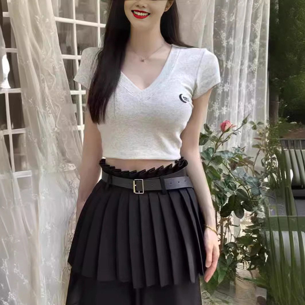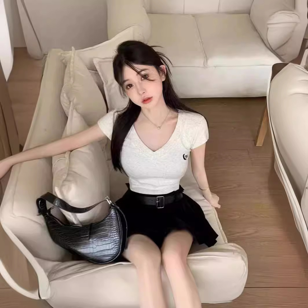 V领绣花甜辣妹夏季新款短款莫代尔上衣短袖t恤女修身百搭显瘦高腰