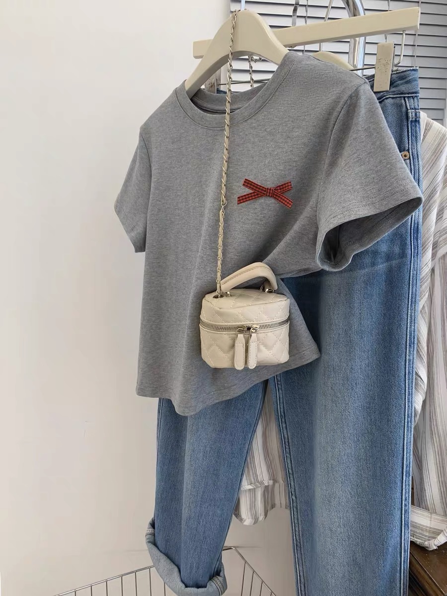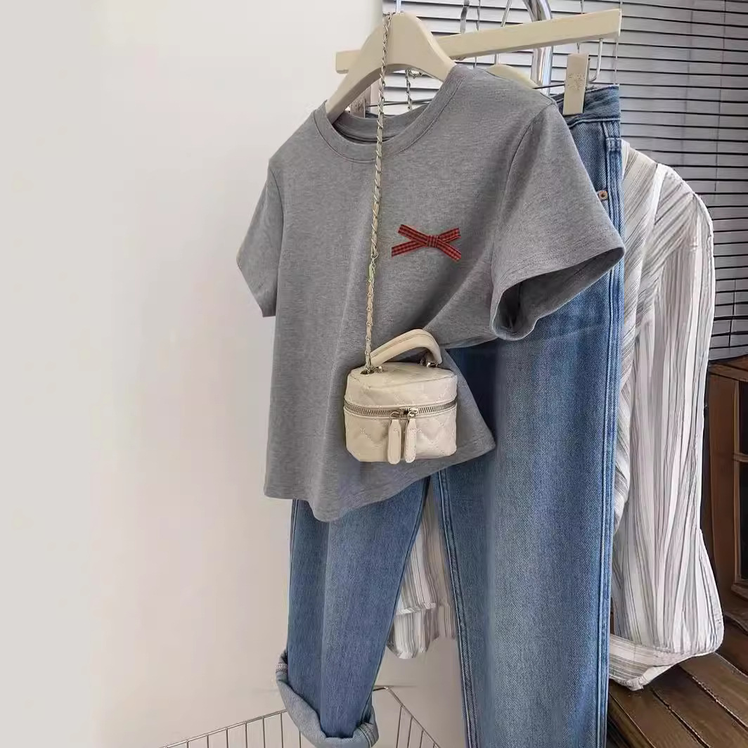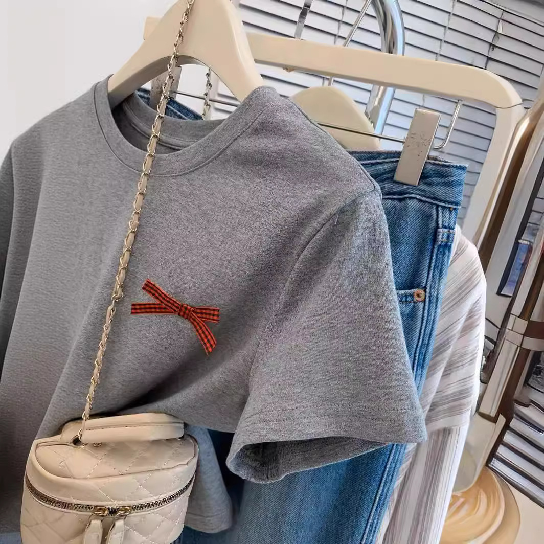 灰色蝴蝶结正肩短袖t恤女夏季新款胖妹妹大码设计感宽松上衣