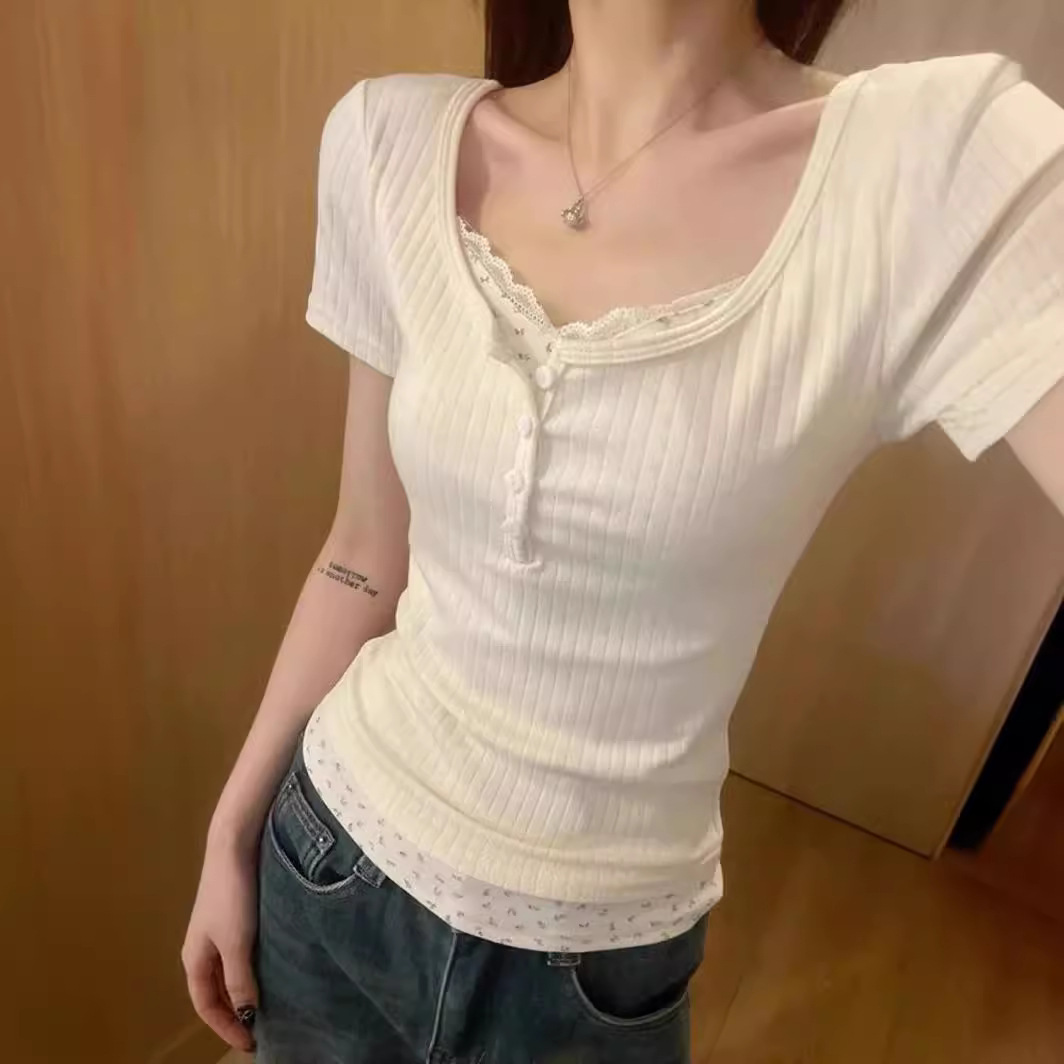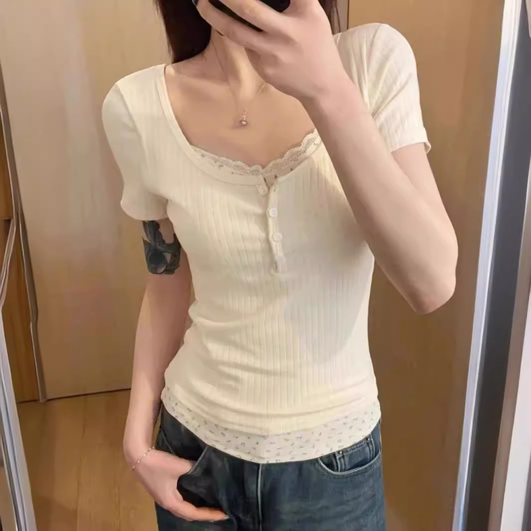 假两件碎花bm短袖t恤女春夏新款设计感蕾丝边修身显瘦半开领上衣