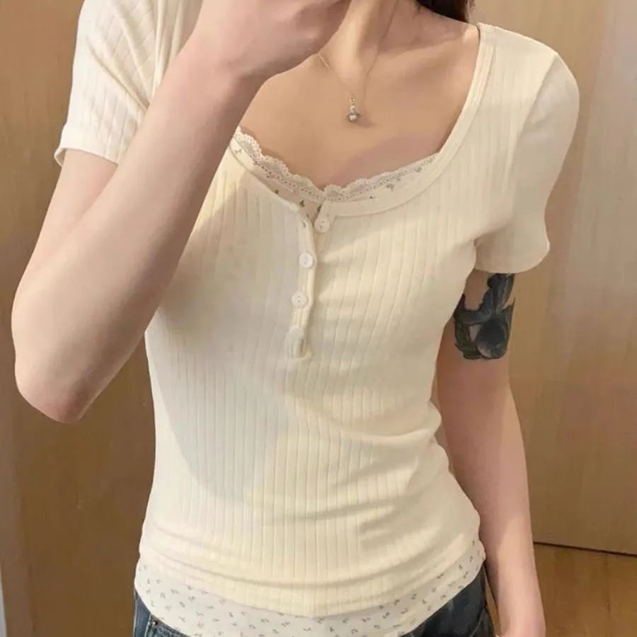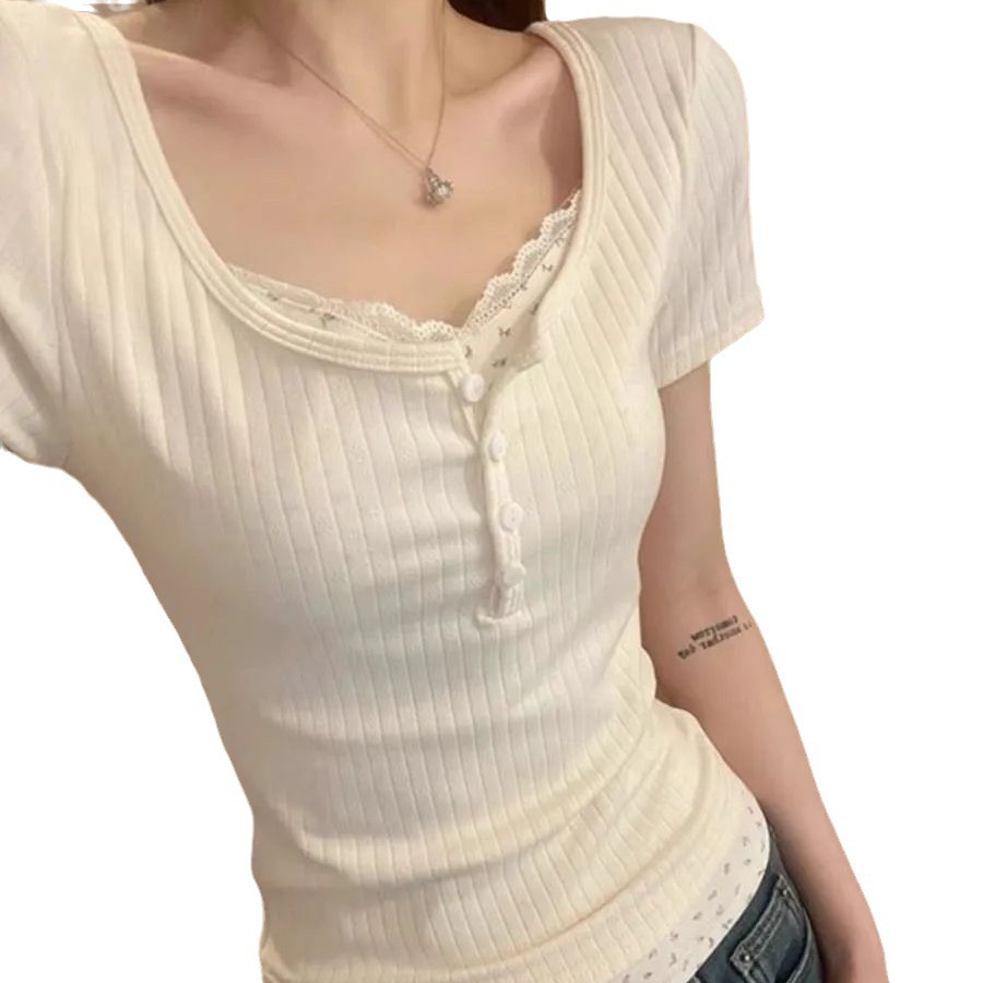 U领短袖女小众设计感百搭夏季修身显瘦短款辣妹锁骨正肩上衣