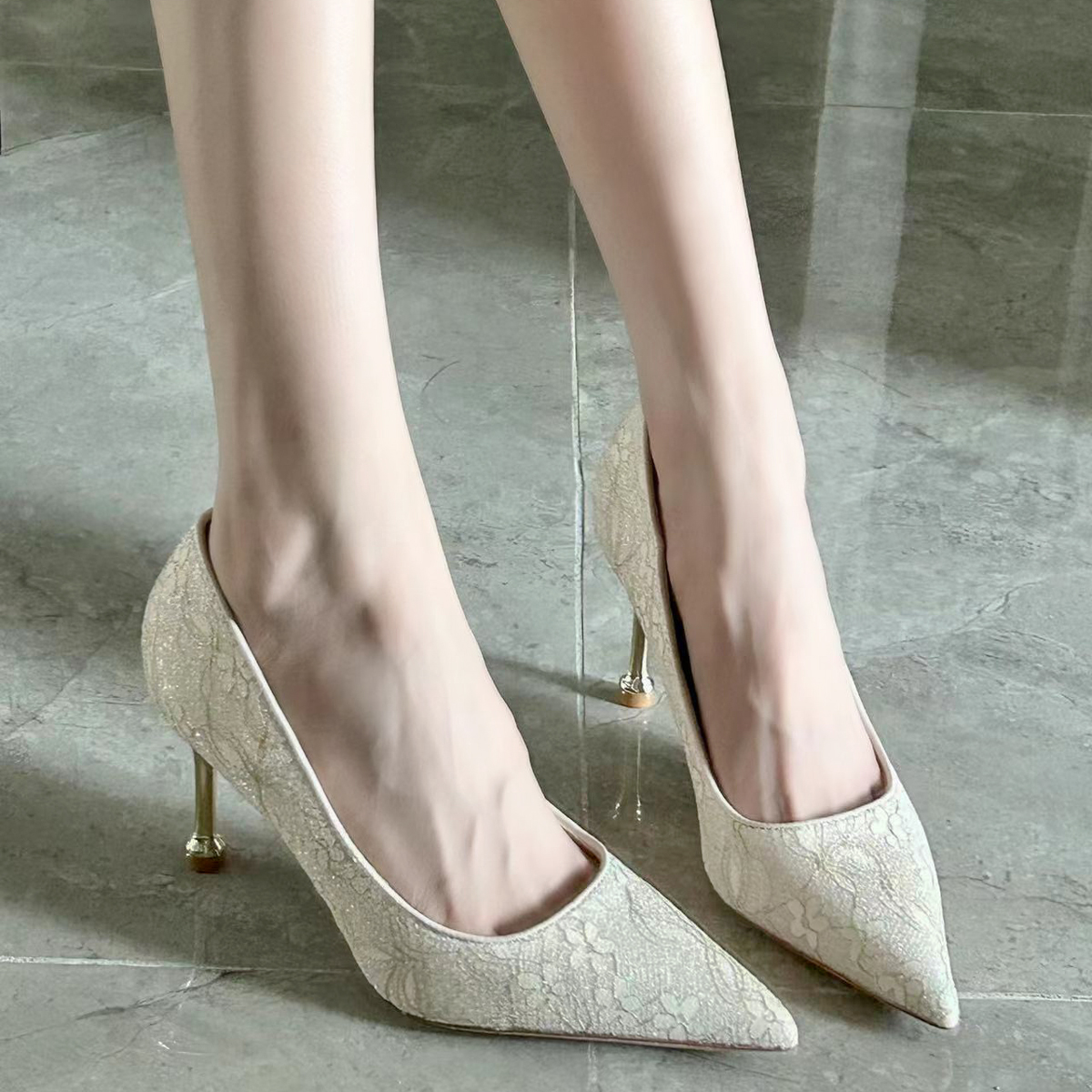 新款法式金色蕾丝高跟鞋女浅口名媛风不累脚细跟单鞋婚鞋