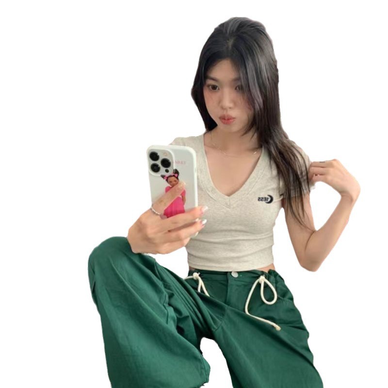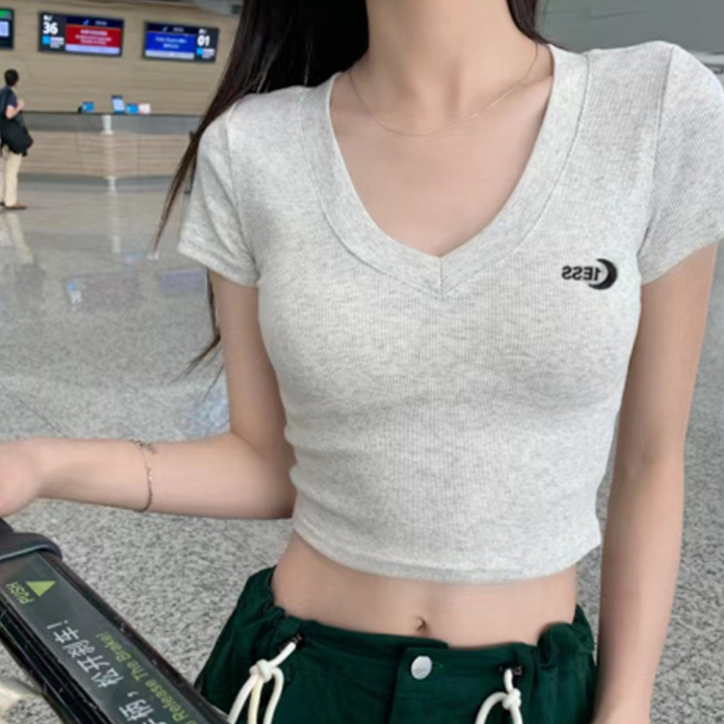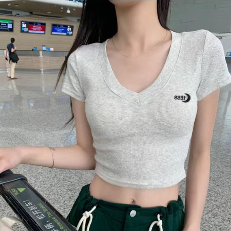 V领绣花甜辣妹夏季新款短款莫代尔上衣短袖t恤女修身百搭显瘦高腰