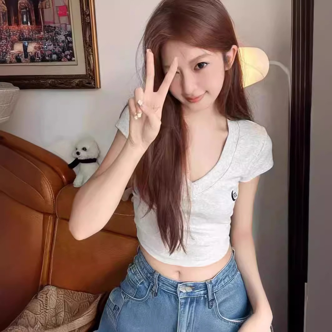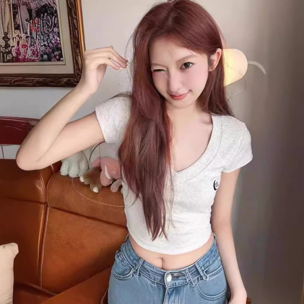V领刺绣短款ins潮上衣甜妹短袖t恤女夏季修身百搭显瘦上衣