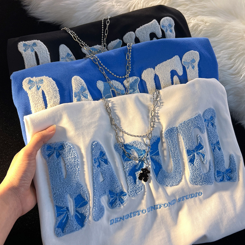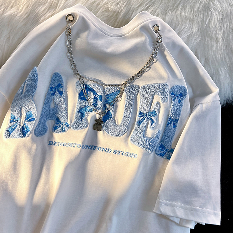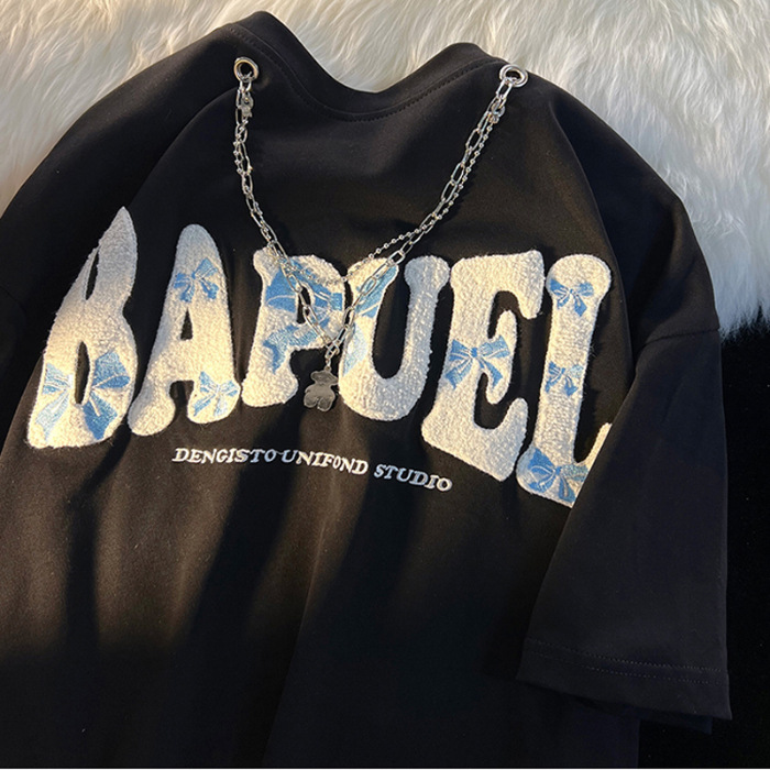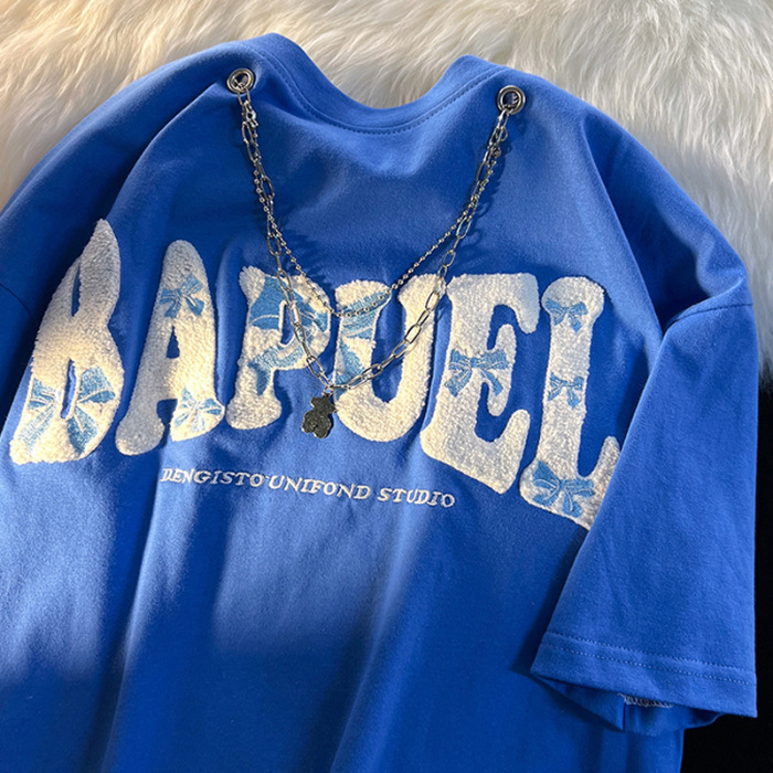 毛巾绣带项链短袖t恤女设计感小众ins潮流美式复古oversize情侣衫