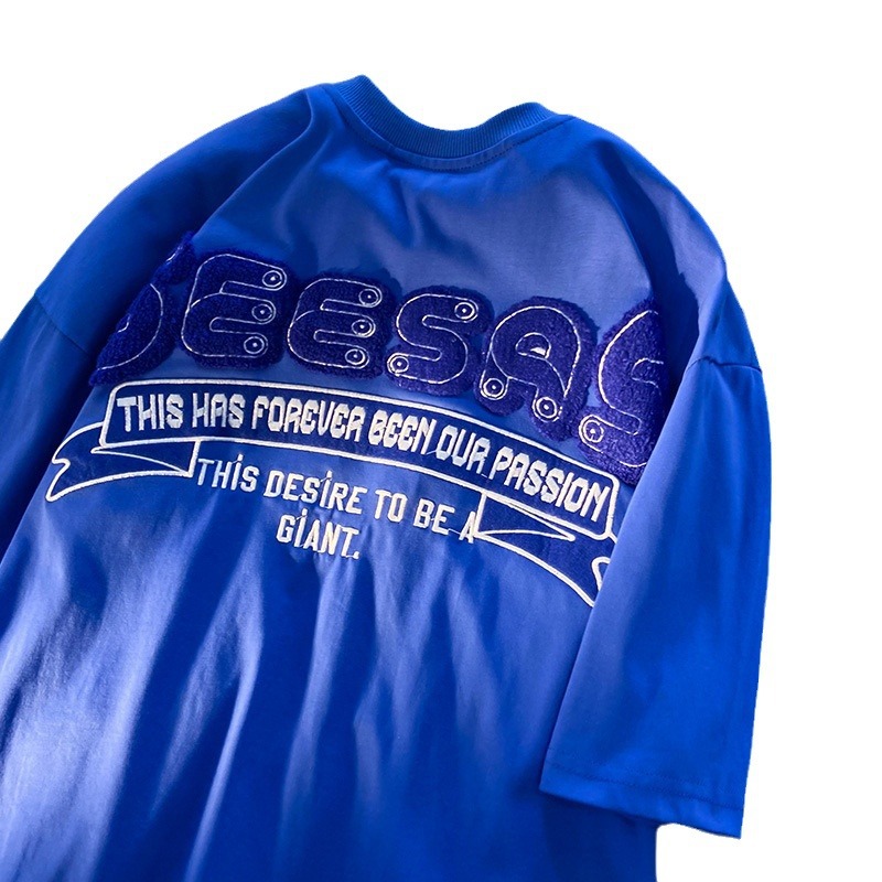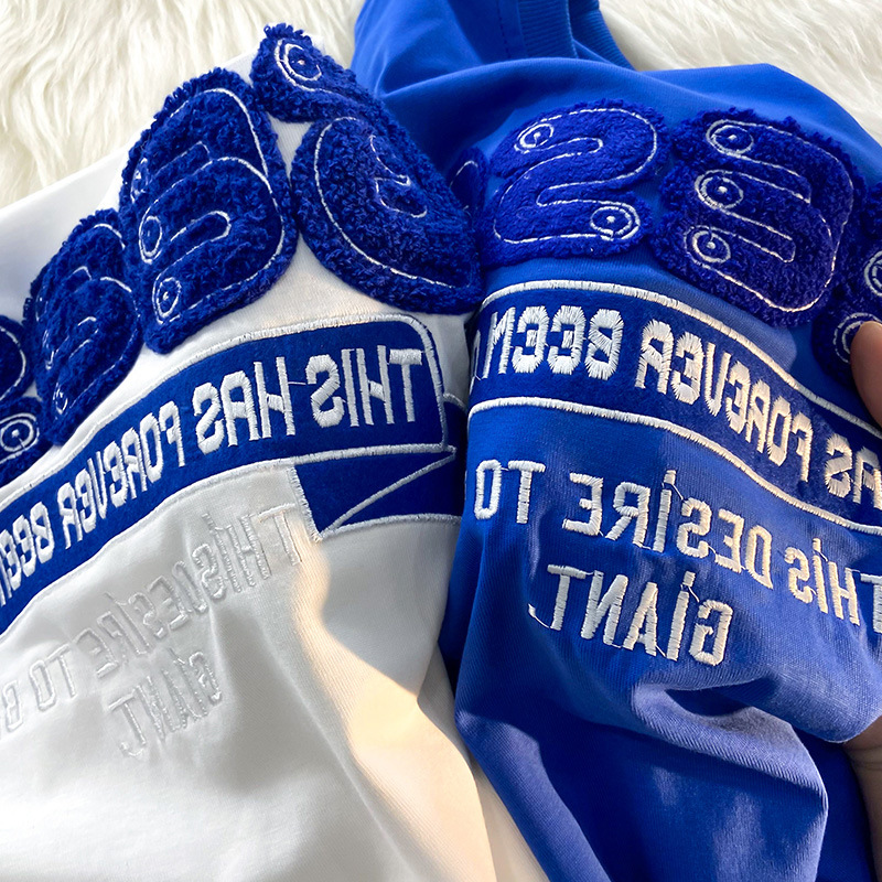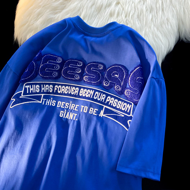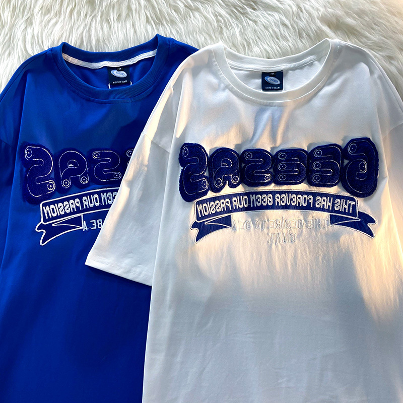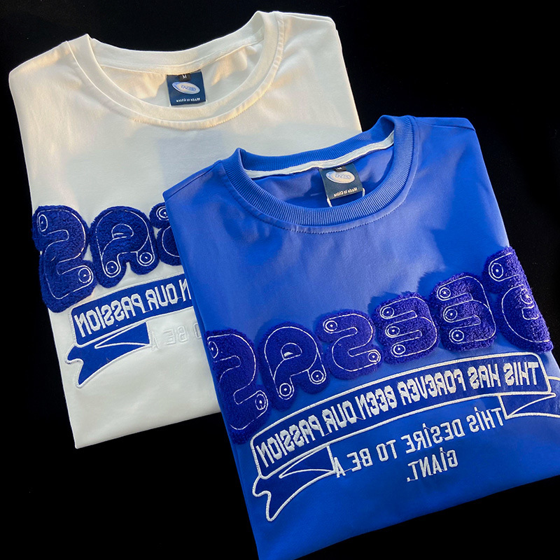 复古重工植绒毛巾绣字母印花短袖t恤女情侣小众宽松显瘦时尚上衣