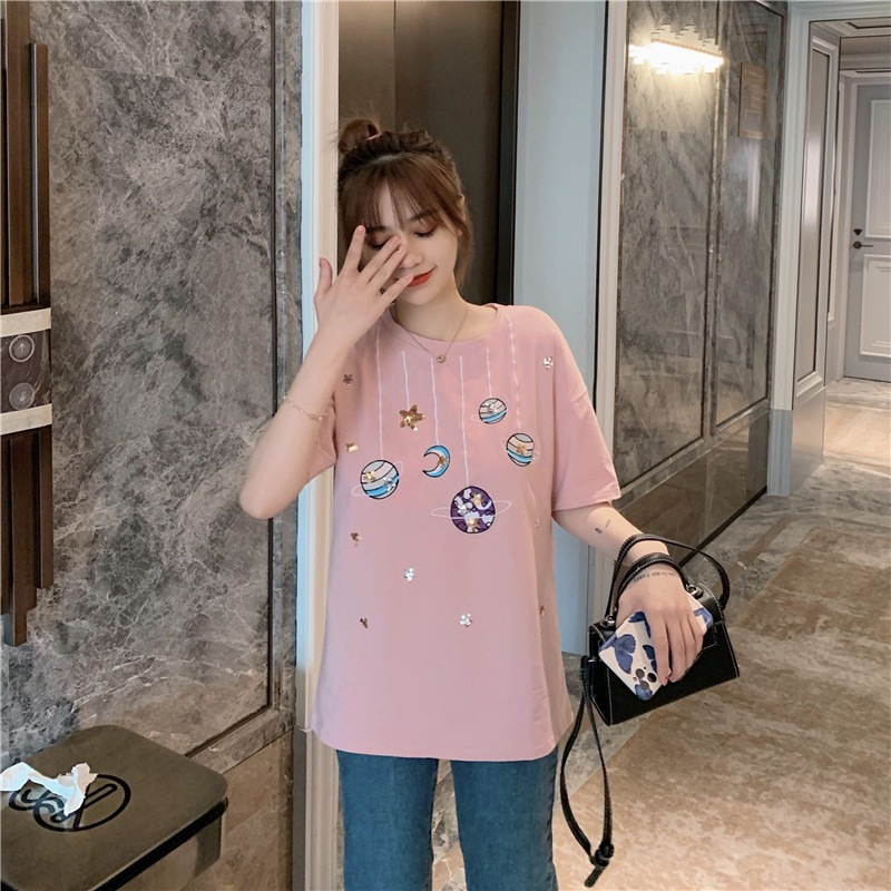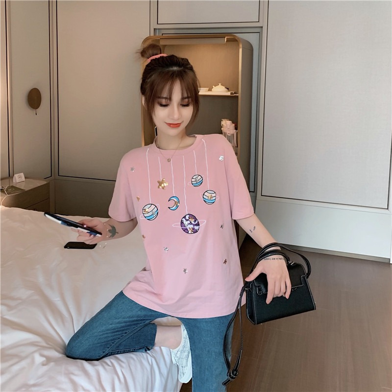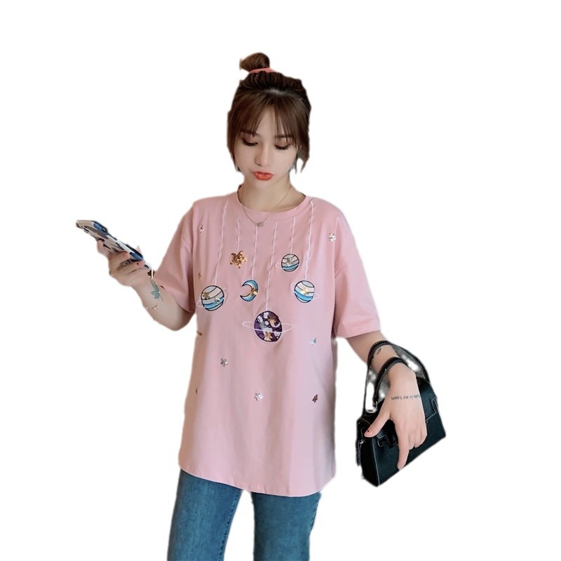 春夏新款短袖T恤女时尚百搭简约显瘦卡通重工刺绣圆领打底衫
