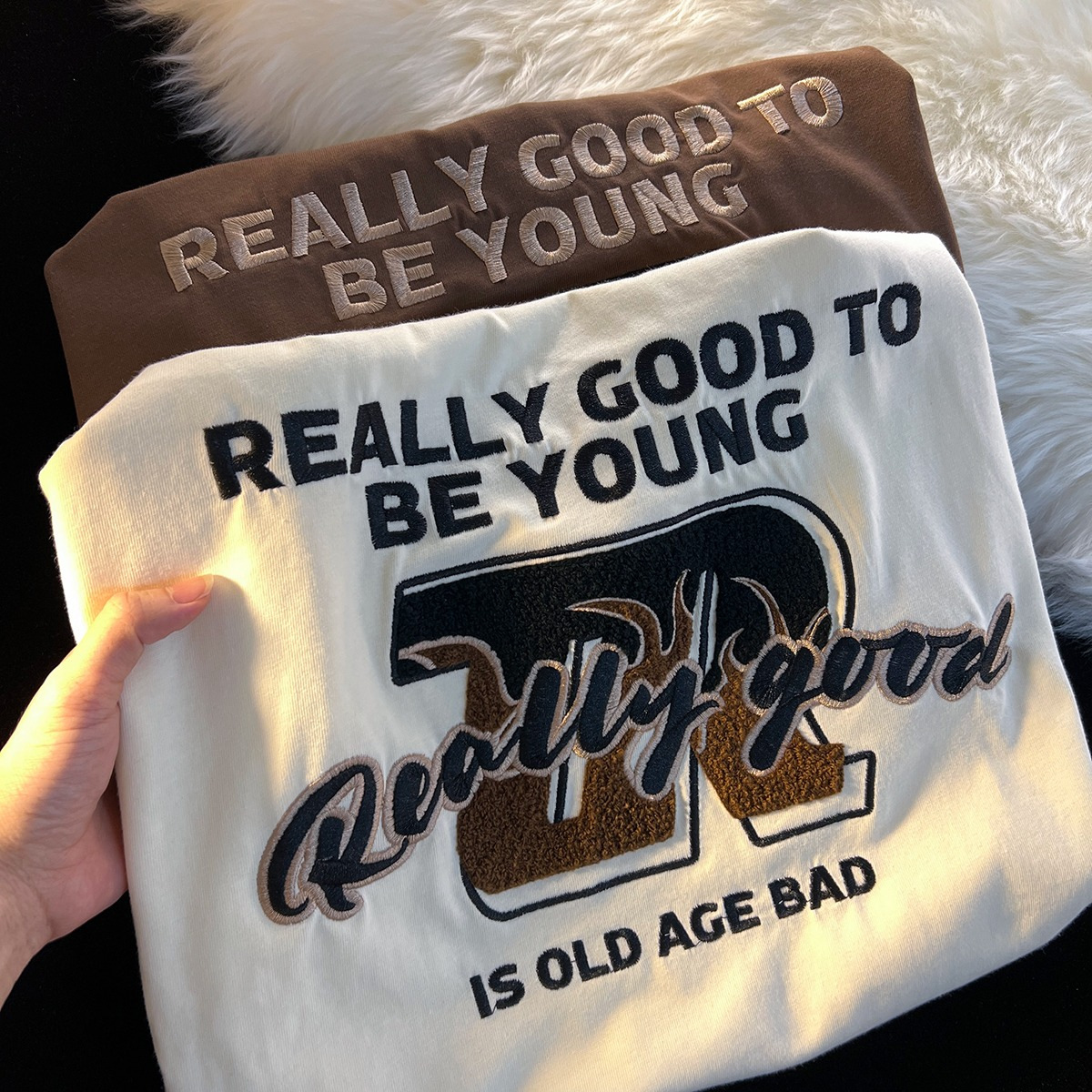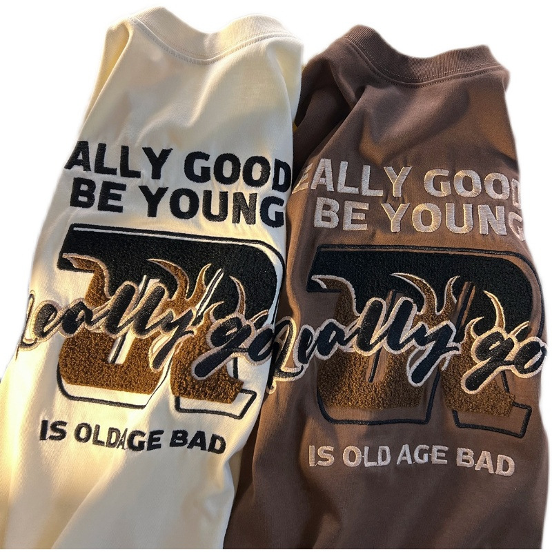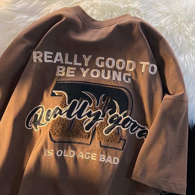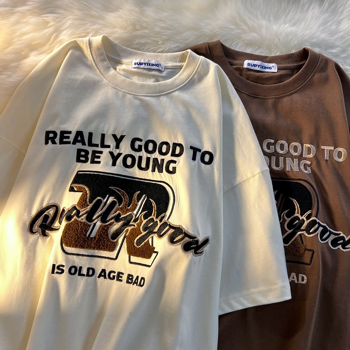 QFD-纯棉美式复古字母植绒刺绣情侣夏装短袖T恤女宽松设计感上衣