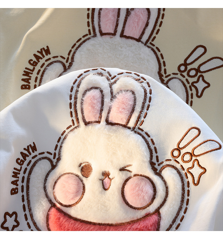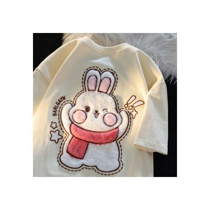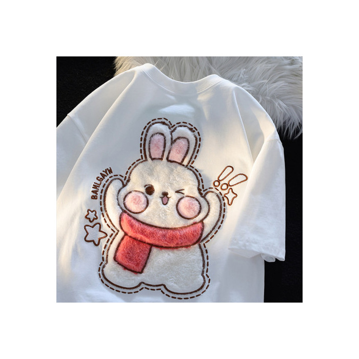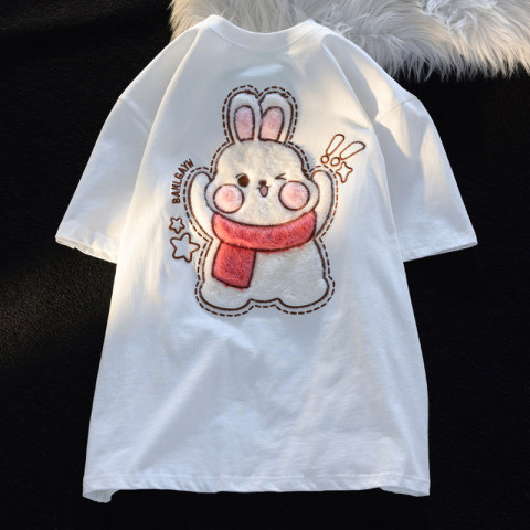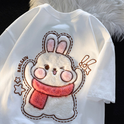 可爱植绒兔子短袖t恤女夏季设计感小众潮绣花宽松闺蜜上衣ins纯棉