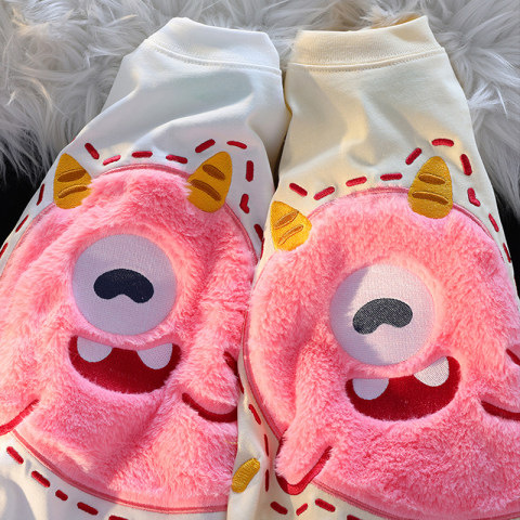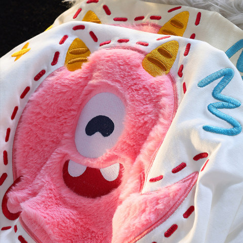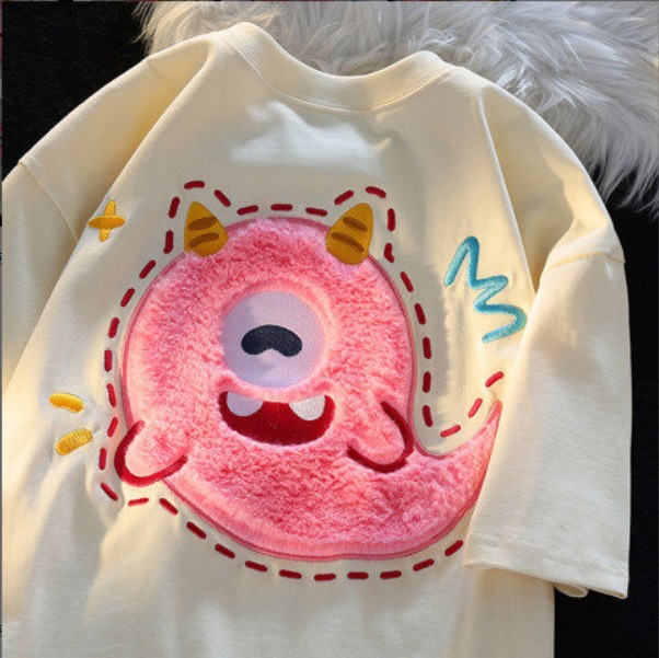 潮牌植绒卡通小蝌蚪怪兽刺绣花t恤男女宽松小众毛绒立体情侣短袖