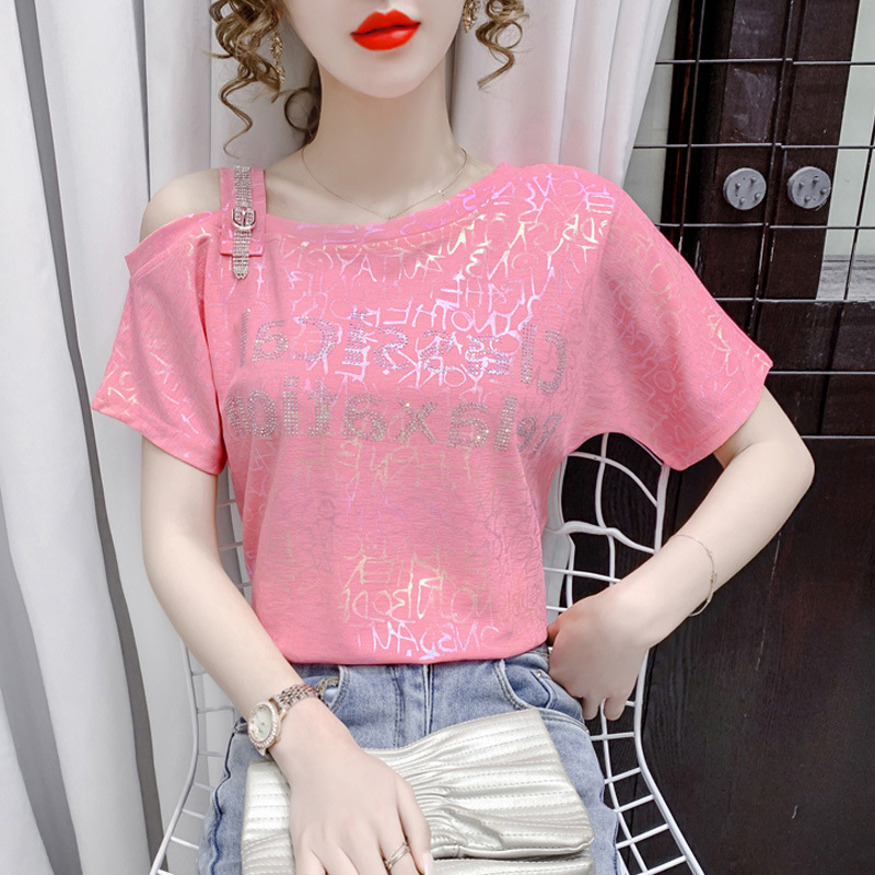 露肩短袖t恤女设计感小众2025新款夏季百搭宽松重工烫钻别致上衣