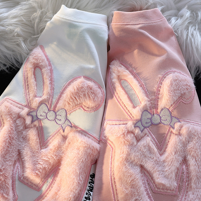 多巴胺纯棉毛绒M字短袖t恤女宽松夏季小众3D立体绣花BF风情侣上衣
