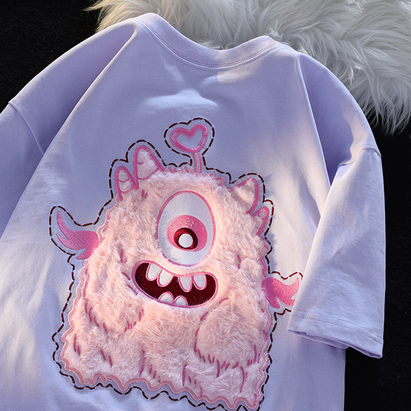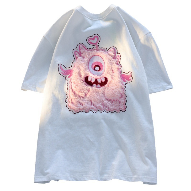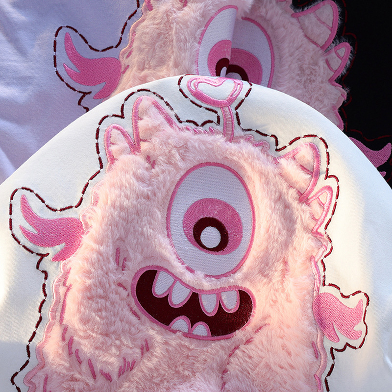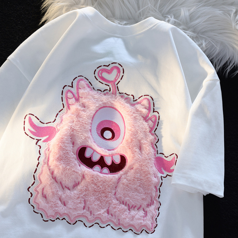 韩版粉色小怪兽T恤男女夏季可爱小众毛绒绒3D立体绣花情侣短袖ins