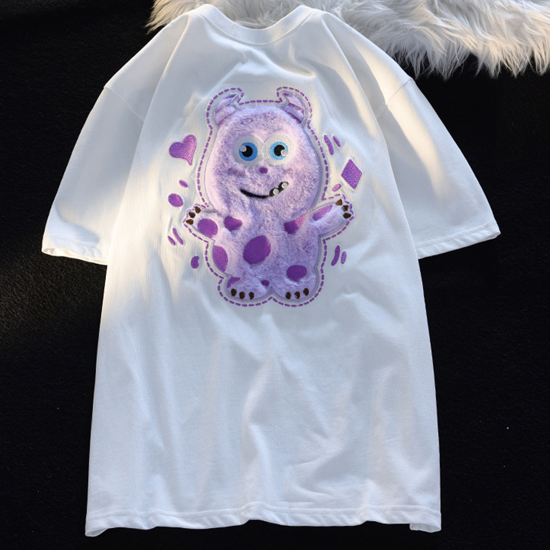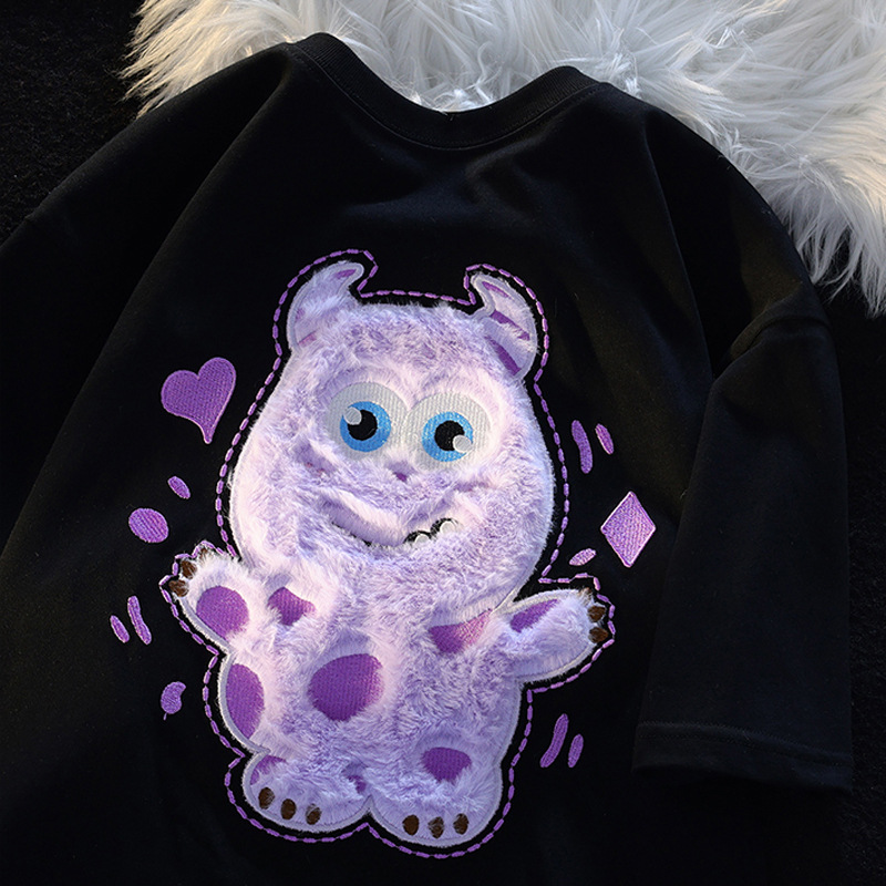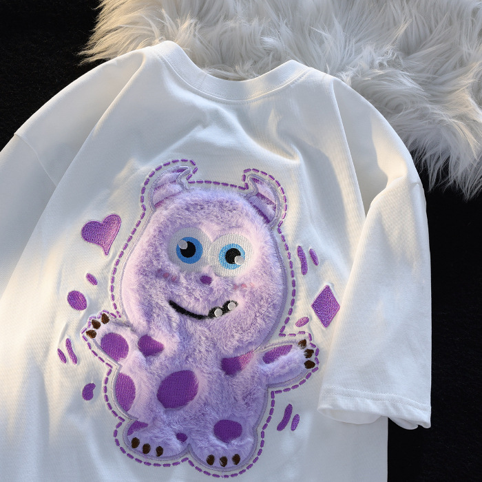 可爱怪兽男女纯棉夏季小众T恤精梳紧密毛绒立体情侣上衣绣花短袖